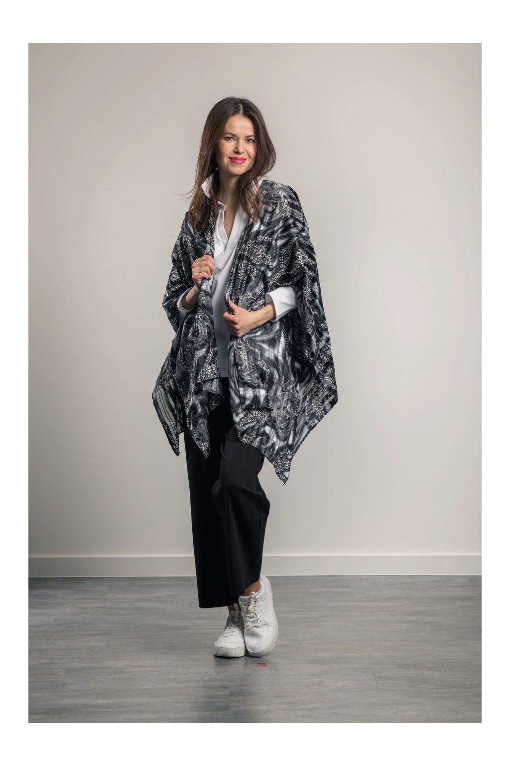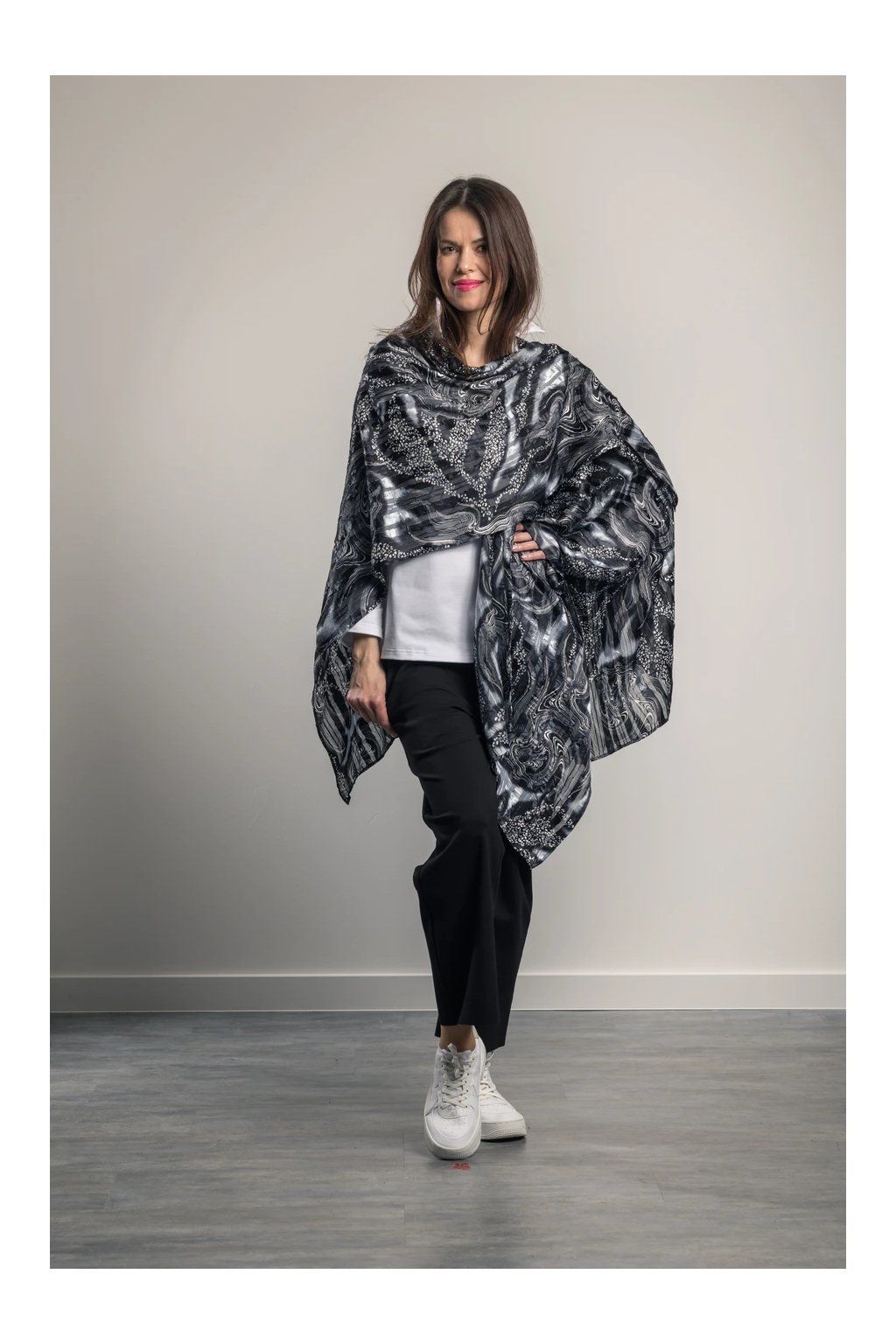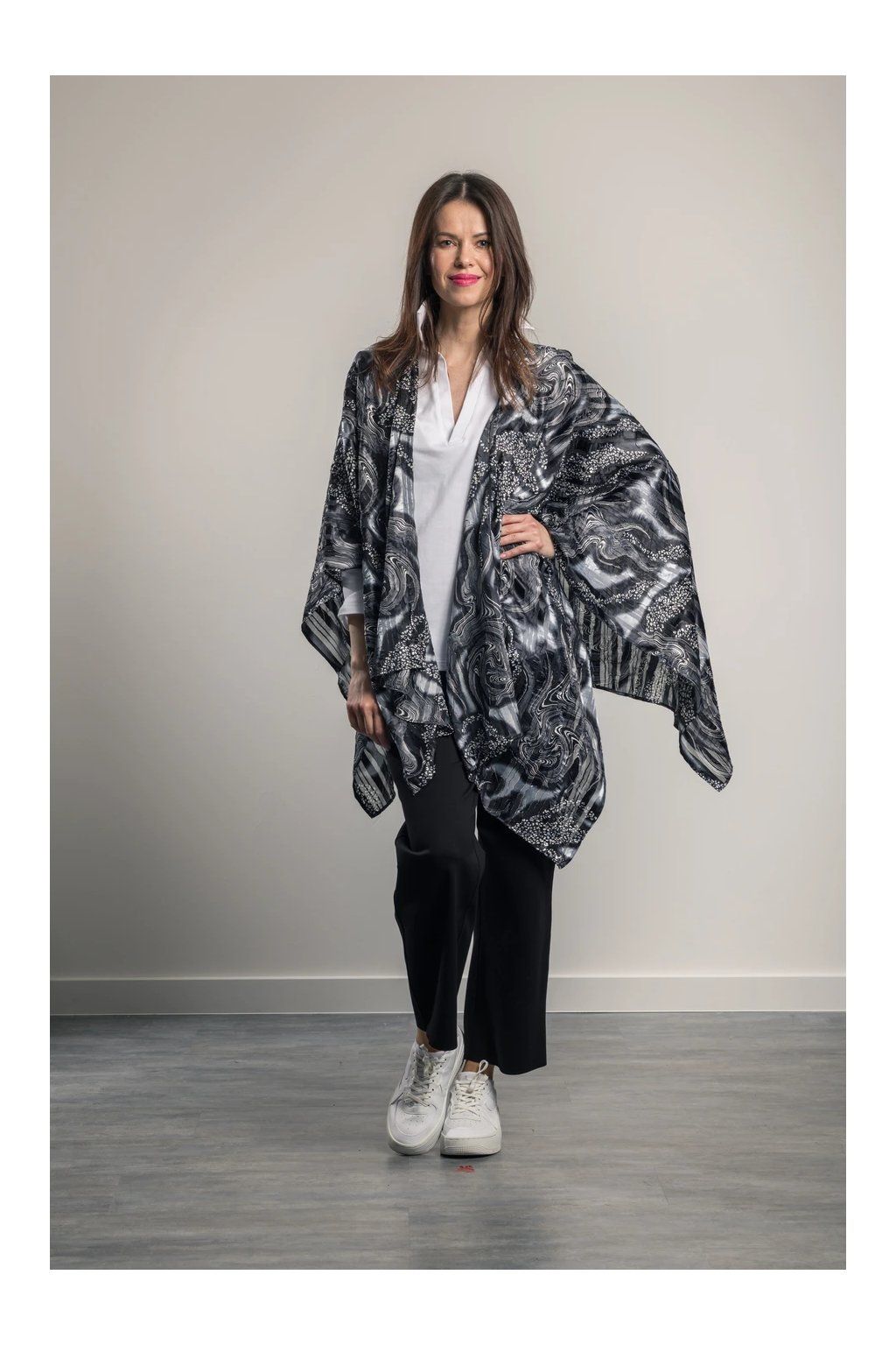 Eleganter, luftiger Plaid mit langen Enden, die die Figur verlängern. Er eignet sich für Sommerkleidung und Badebekleidung. Knitterfreies Material. Trocknet schnell.