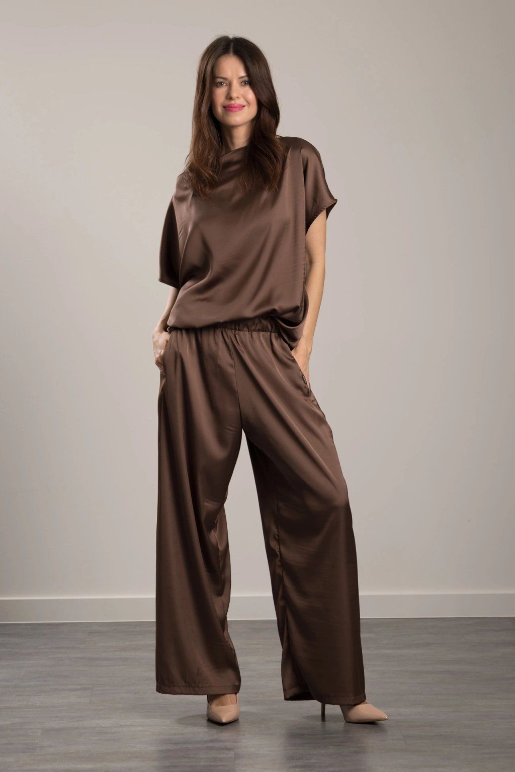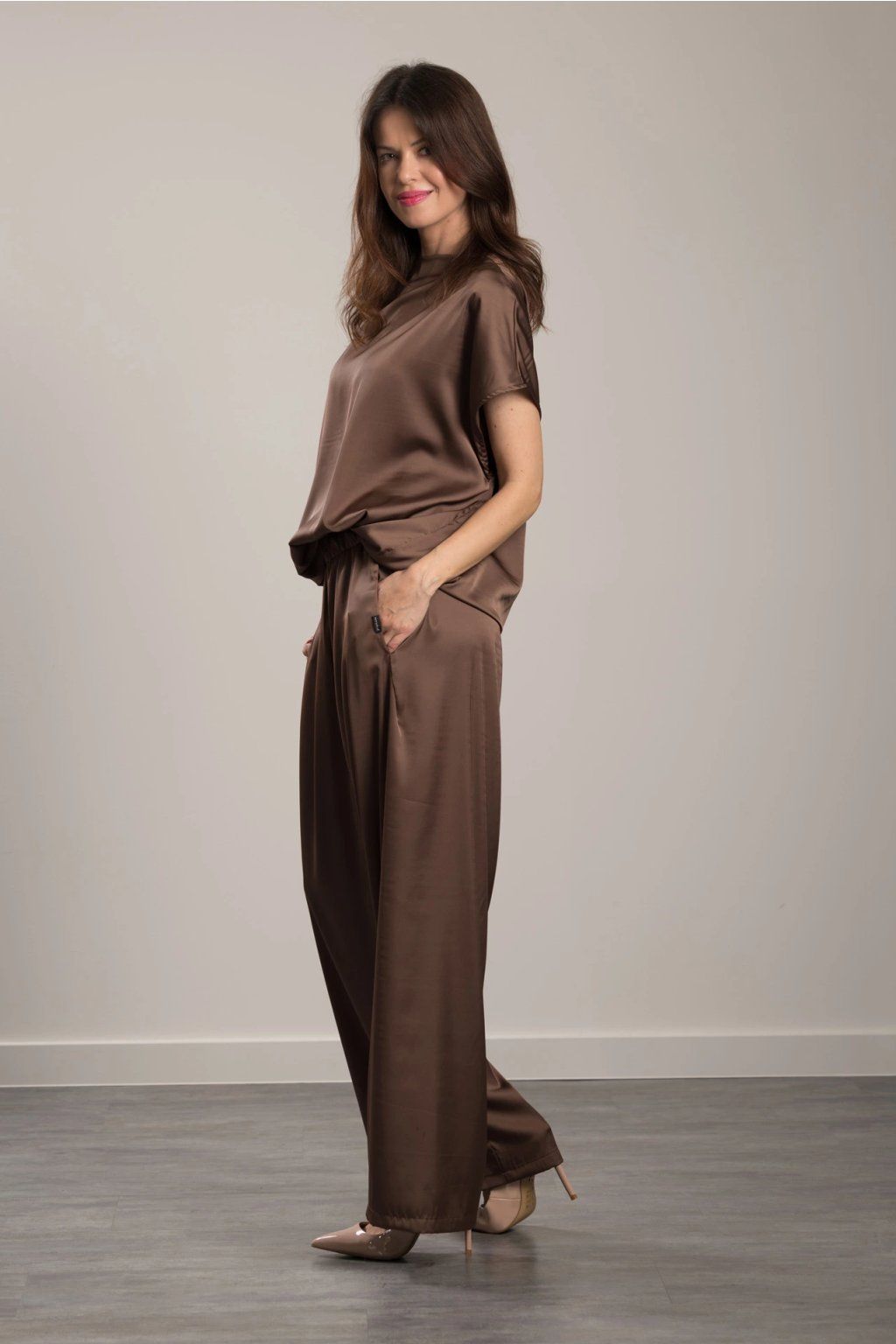 Entdecken Sie die perfekte Kombination aus Eleganz und Komfort mit unserer Satin-Hose Sara Silk. Lange, weit geschnittene Hosen für einen zeitlosen und eleganten Look für endlose Outfit-Variationen. Sie sind für jede Figur geeignet, zu eleganten Schuhen und Turnschuhen.
