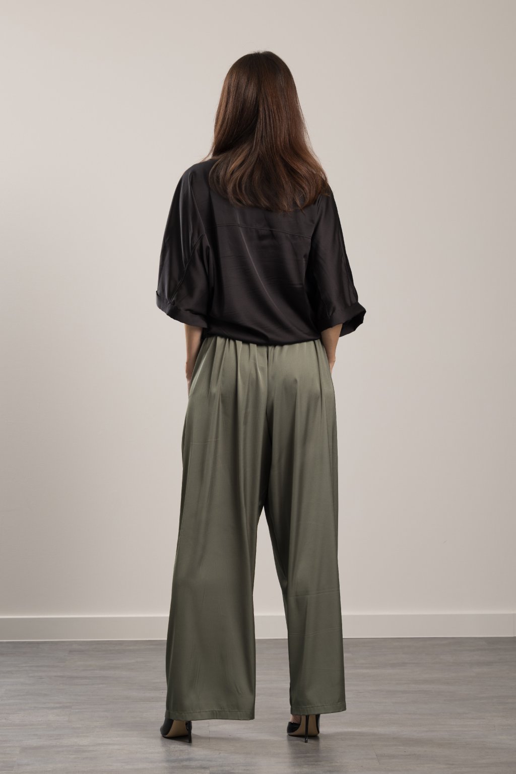 Entdecken Sie die perfekte Kombination aus Eleganz und Komfort mit unserer Satin-Hose Sara Silk. Lange, weit geschnittene Hosen für einen zeitlosen und eleganten Look für endlose Outfit-Variationen. Sie sind für jede Figur geeignet, zu eleganten Schuhen und Turnschuhen.