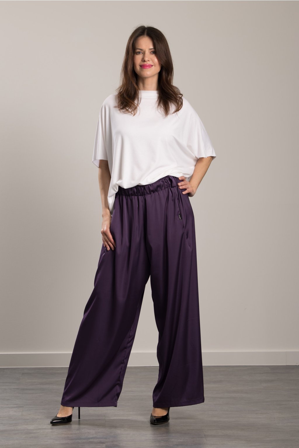 Entdecken Sie die perfekte Kombination aus Eleganz und Komfort mit unserer Satin-Hose Sara Silk. Lange, weit geschnittene Hosen für einen zeitlosen und eleganten Look für endlose Outfit-Variationen. Sie sind für jede Figur geeignet, zu eleganten Schuhen und Turnschuhen.