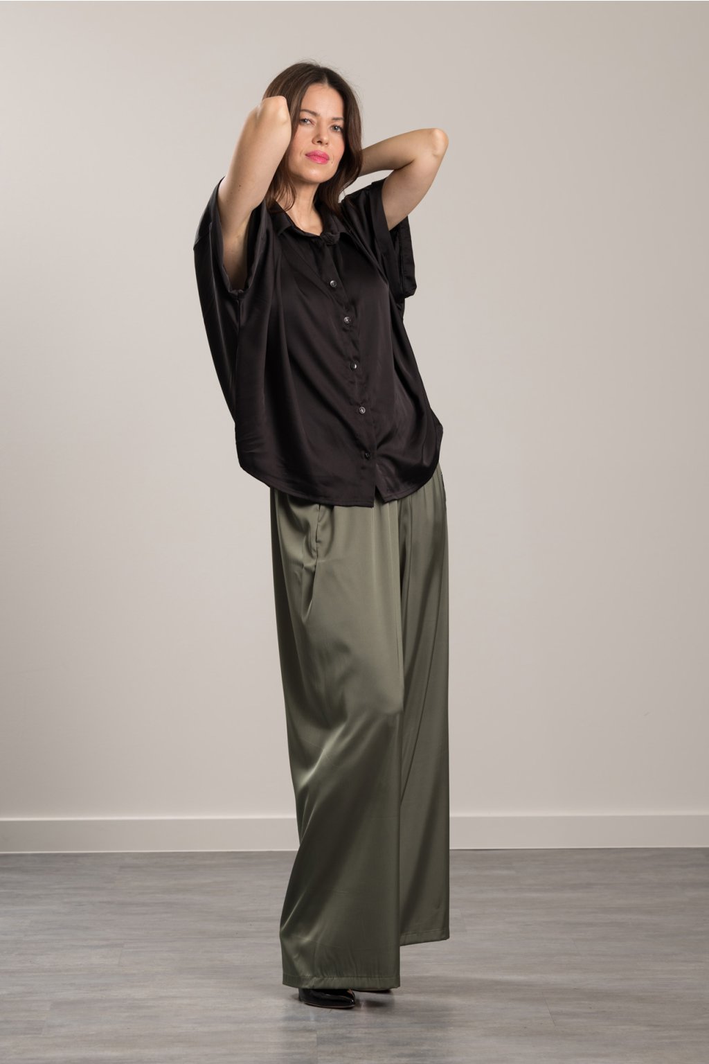 Frische Seidenbluse Schwarz Satinbluse mit Knöpfen