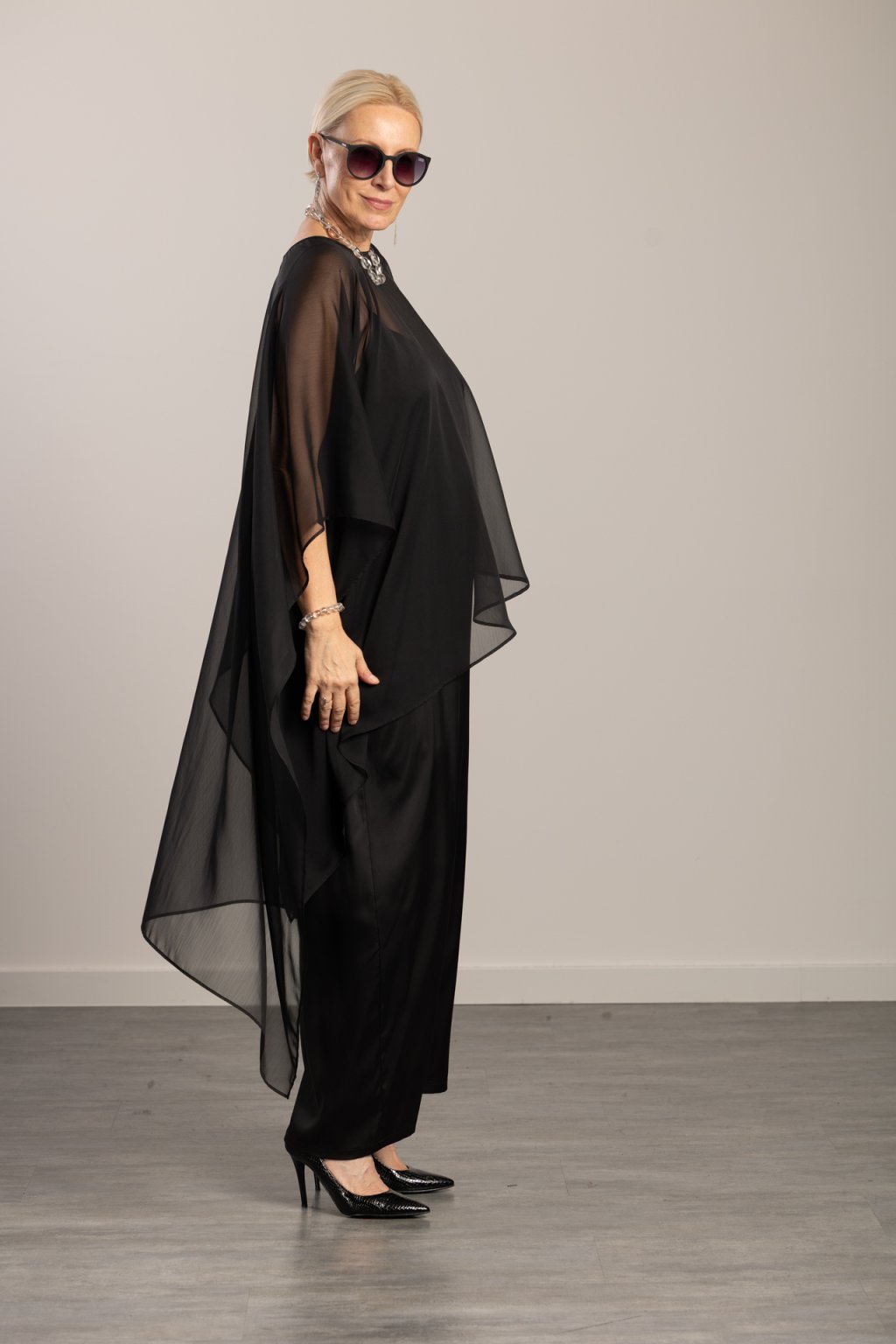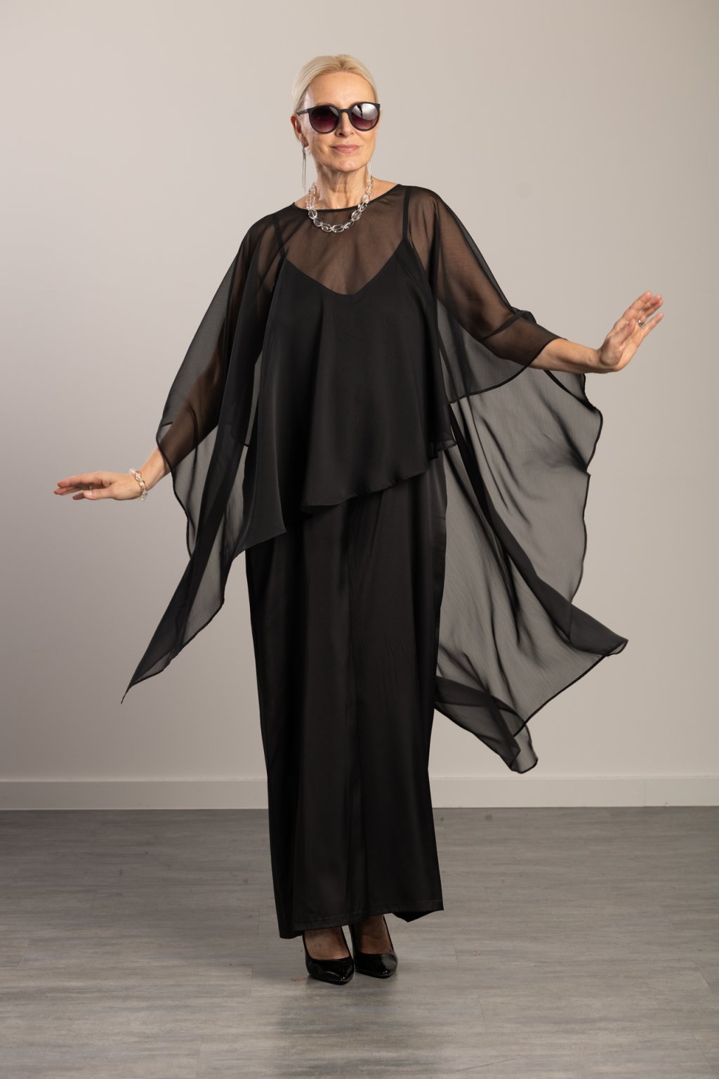 Elegantes Damenponcho, geeignet für gesellschaftliche Anlässe, aber auch für den Sommer. Das Poncho kann über Kleidern, aber auch zu Hosen getragen werden. Sehr origineller Schnitt, der jeder Figur schmeichelt. Schönes Material, das Reflexe erzeugt. Transparent, leicht. FARBE: Schwarz