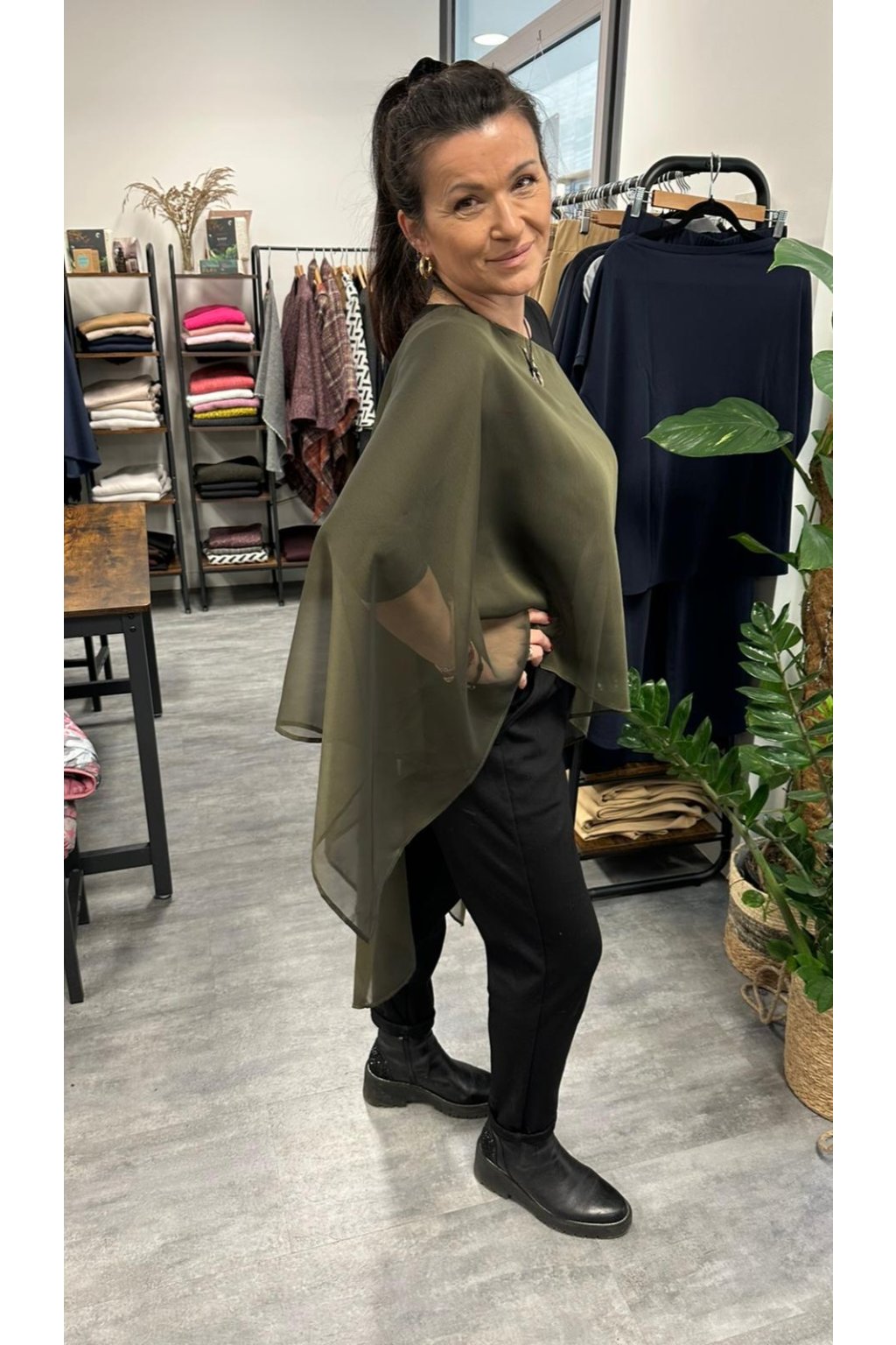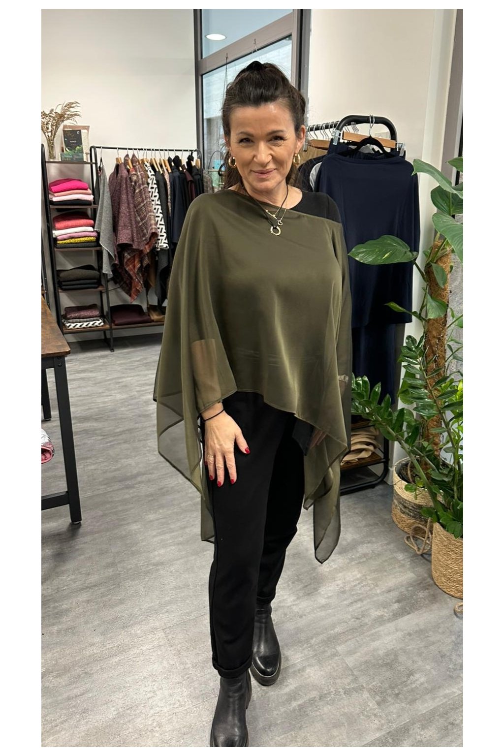 Ist das Poncho für alle Figurtypen geeignet? Ja! Dank seines universellen Schnitts und des flexiblen Materials passt sich das Poncho den meisten Figuren an und sieht an jeder Frau elegant aus.