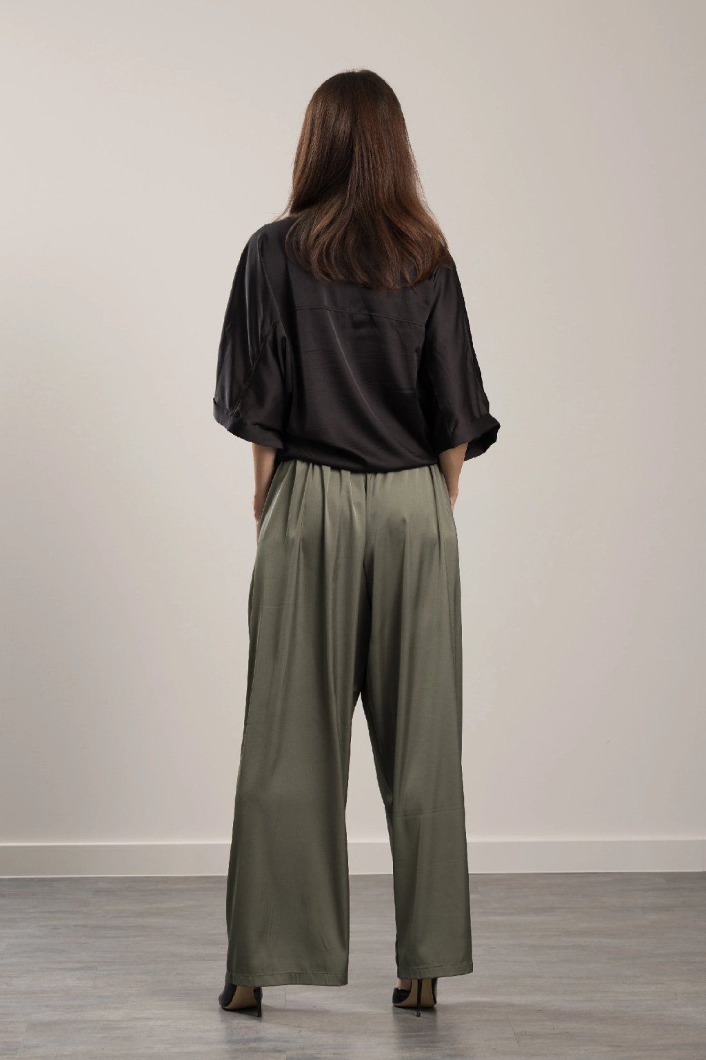 Elegant Sara Silk Olive Trousers Elegant satin trousers