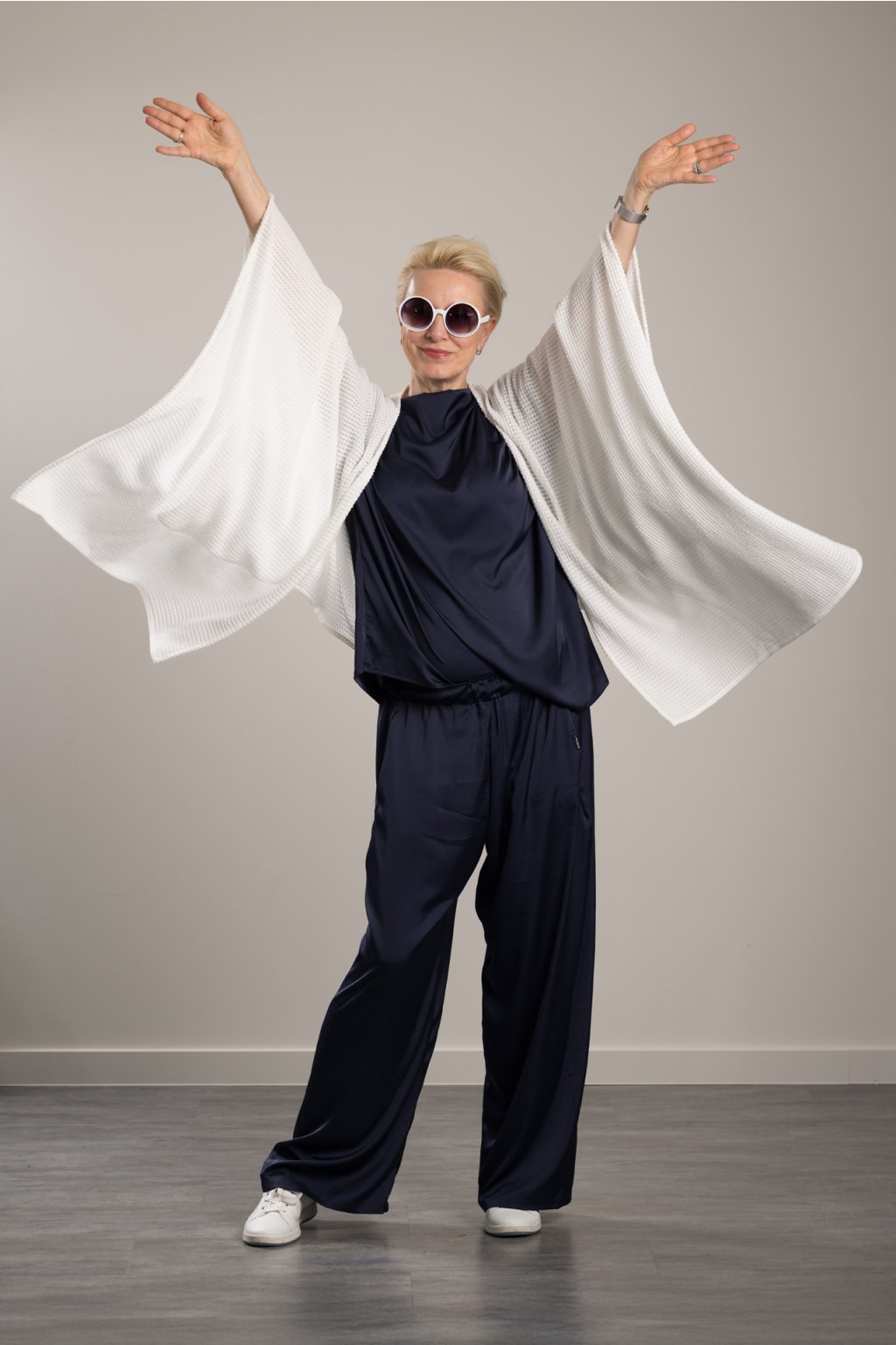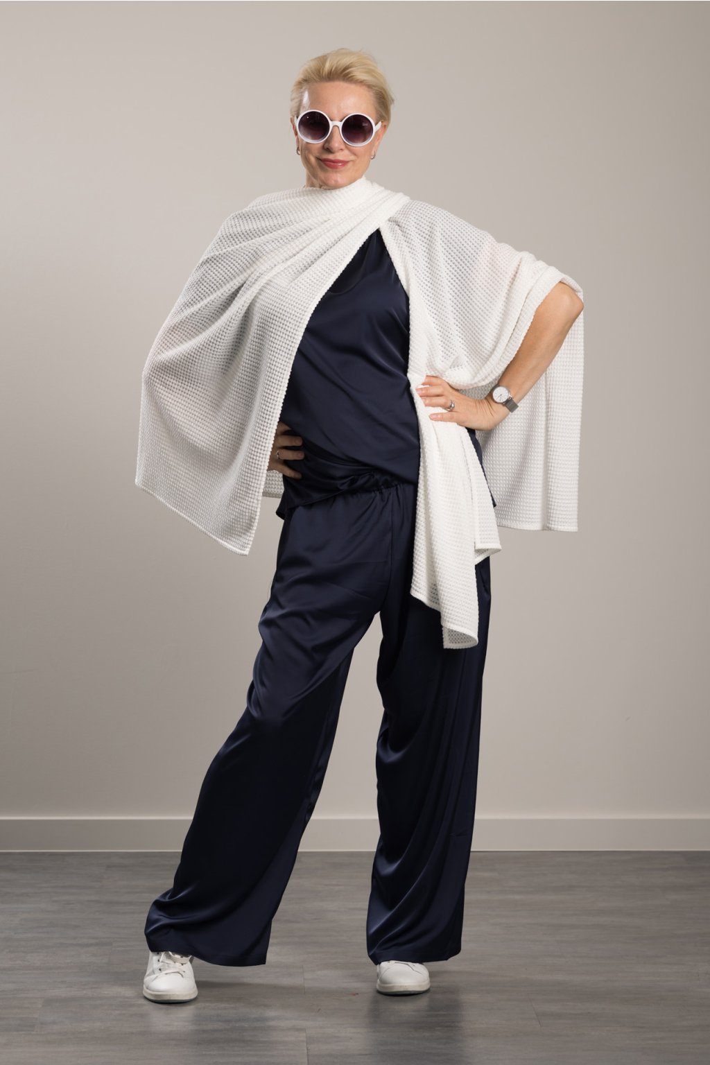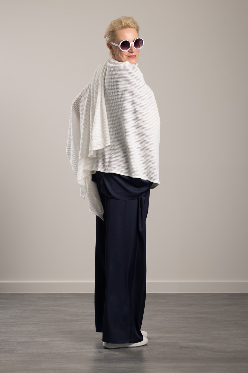 Flowing and pleasant to the touch, this fine knit throw with a waffle pattern is ideal not only for summer days, but also for light layering all year round. Waffle texture adds an elegant and casual touch to your outfit, while the flowing cut ensures maximum comfort. Wear it loosely over your shoulders, as a scarf or as an elegant addition to a coat – you'll always look chic and feel great.