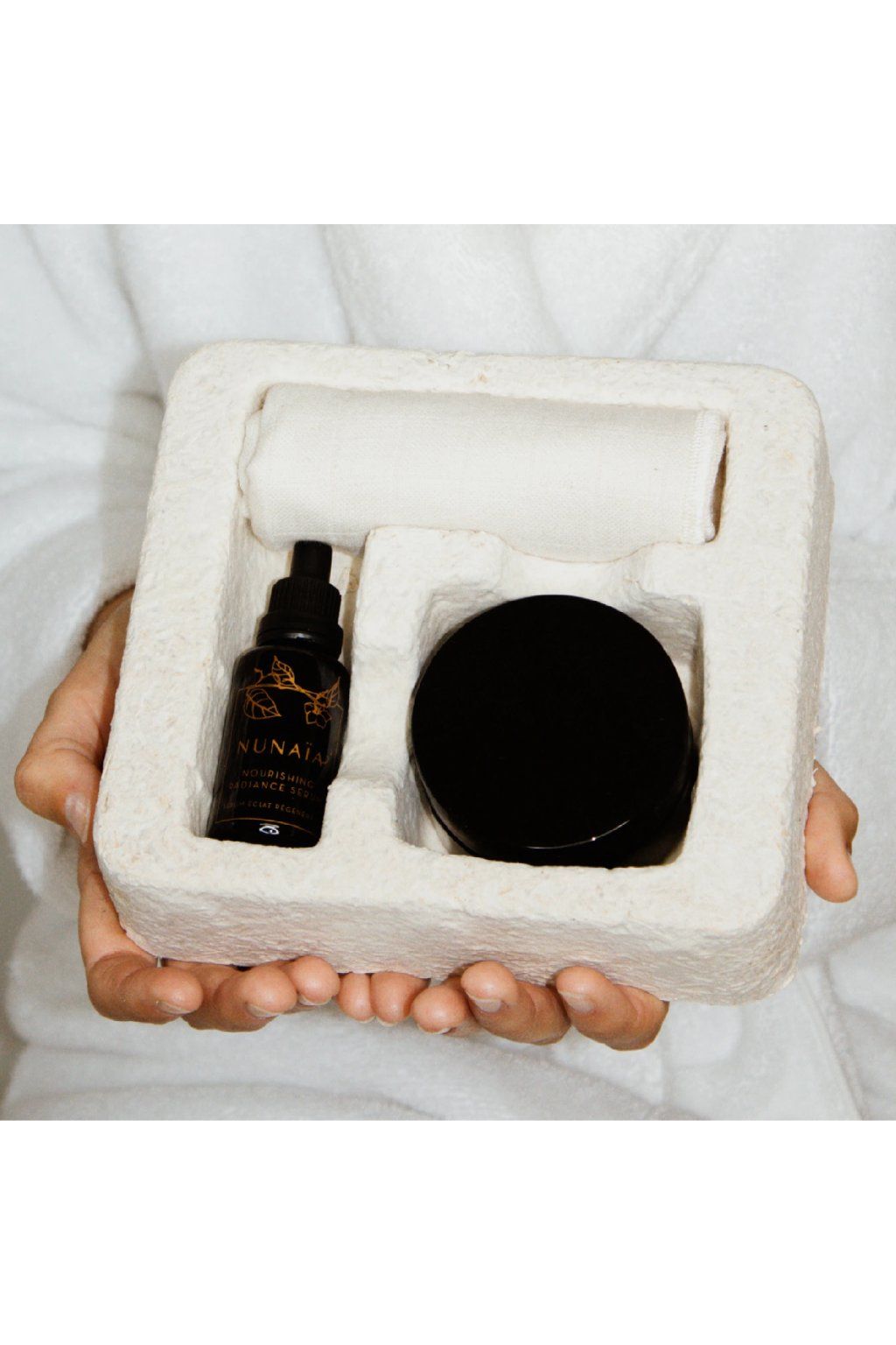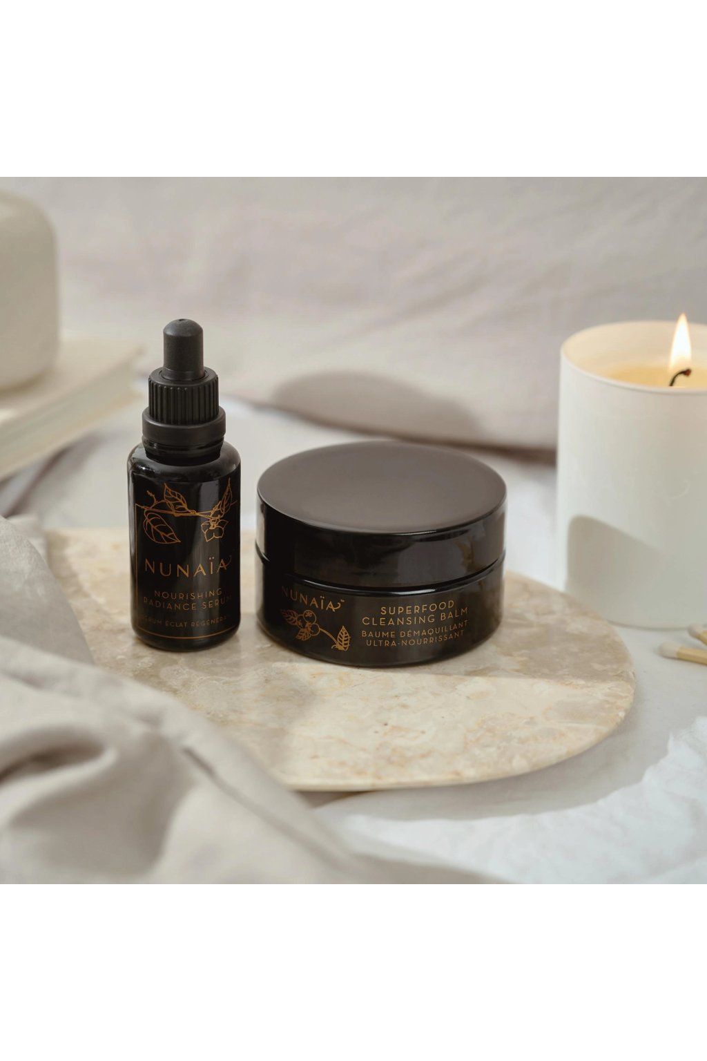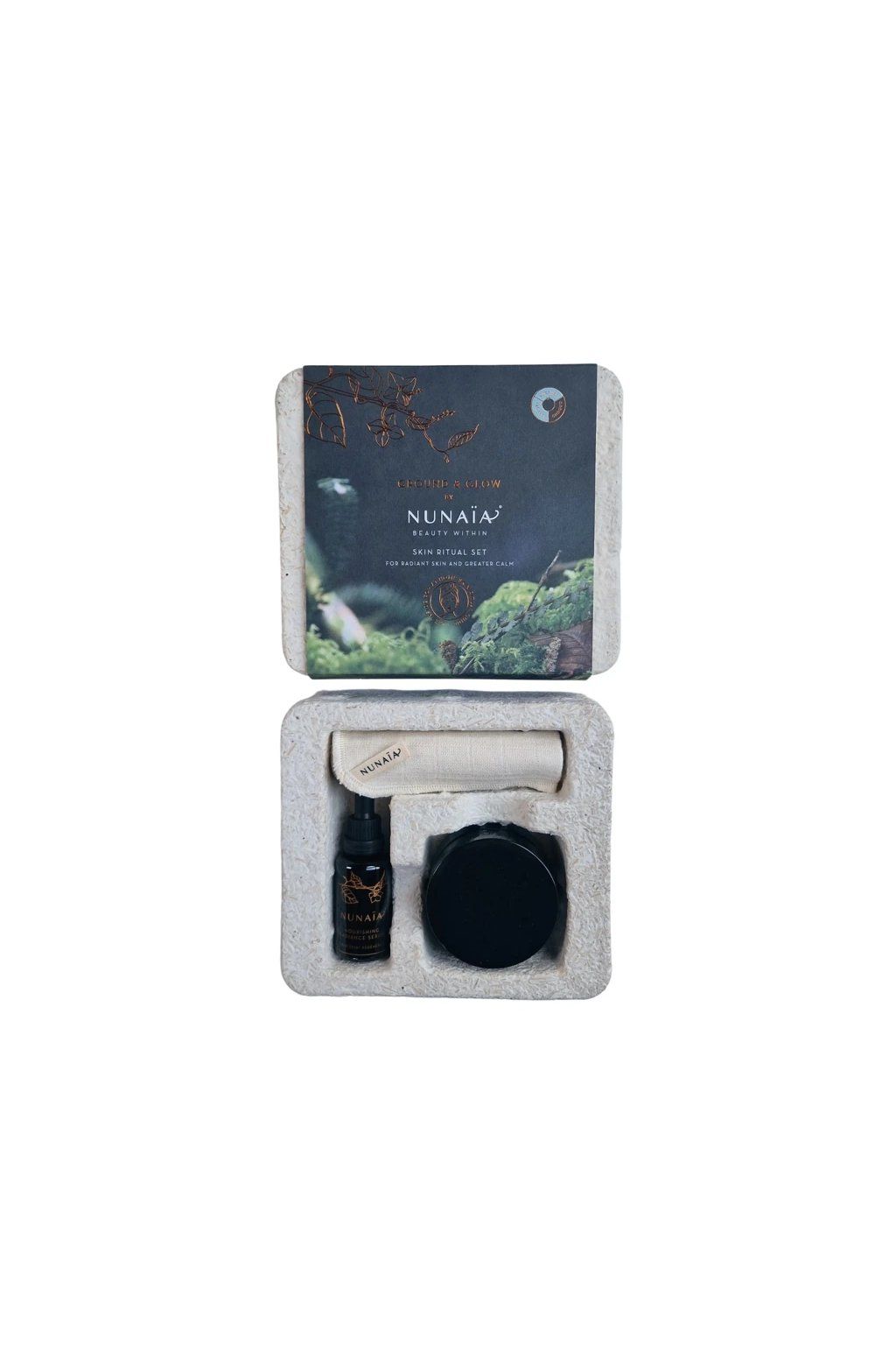 Ground & Glow Ritual Set je součástí fází VYŽIVENÍ a OBNOVA rituálu Nunaïa Ritual™, který podporuje péči o pleť i duši.