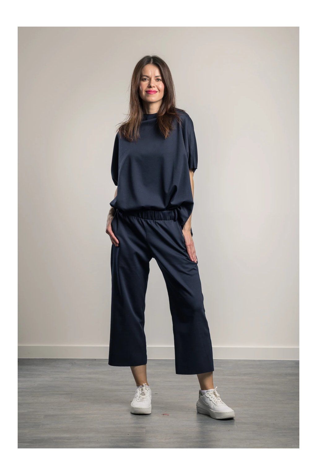 Stylové, pohodlné a dokonale přizpůsobivé – tyto kalhoty jsou ideálním kouskem do šatníku každé ženy. Mají sofistikovanou délku nad kotníky. Kombinují eleganci s praktičností a jejich nadčasový design se hodí pro různé příležitosti. Nejenže jsou neuvěřitelně pohodlné, ale také vám pomohou opticky vylepšit postavu.Kalhoty mají v pase širokou, pohodlnou gumu, která vpředu opticky zeštíhluje bříško, zatímco vzadu jsou jemně nabrané pro maximální flexibilitu a komfort. V létě s teniskami či žabkami, celoročně s lodičkami nebo kozačkami. Barva: tmavě modrá