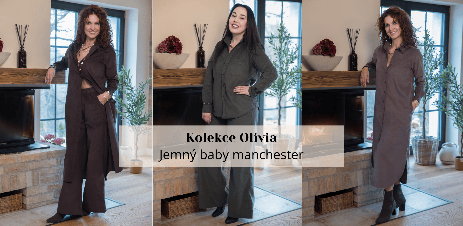 Kolekce Olivia je oslavou přirozené elegance, pohodlí a nadčasového stylu. Je ušitá z jemného baby manšestru ze 100% bavlny – materiálu, který je mimořádně hebký, příjemný na dotek a krásně drží tvar. Právě jeho jemná struktura dává celé kolekci měkký, sofistikovaný charakter, který si zamilujete na první obléknutí.