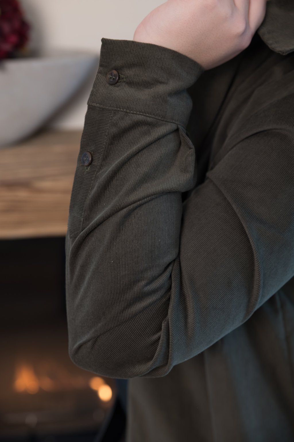 Právě jemná manšestrová textura dodává košili hloubku a osobitost. Není výrazná okázale, ale přesto nepřehlédnutelná. Spodní okraj je lehce zaoblený a na bocích vykrojený, díky čemuž košile krásně sedí a snadno se kombinuje – volně přes kalhoty i jemně zastrčená.
