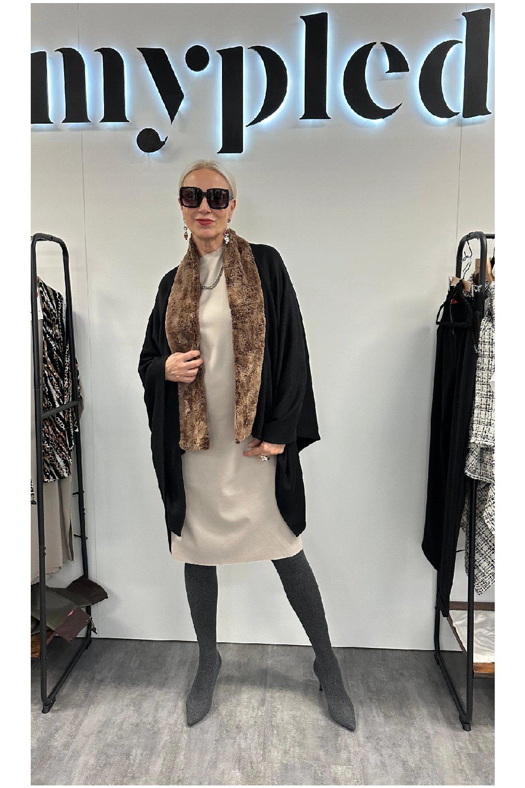 Tento jedinečný kus oblečení není jen o zahřátí během chladných dnů a večerů. Je to vaše módní prohlášení, které říká, že víte, co znamená skutečný styl. Béžová svetrovinová tkanina v kombinaci s eco-friendly černou kožešinou vytváří kontrast, který jednoduše nejde přehlédnout.