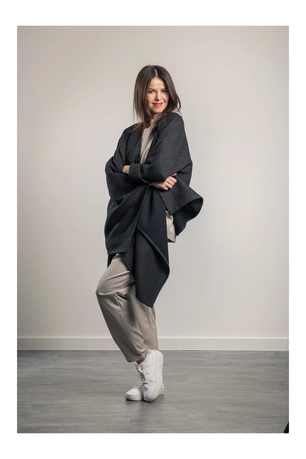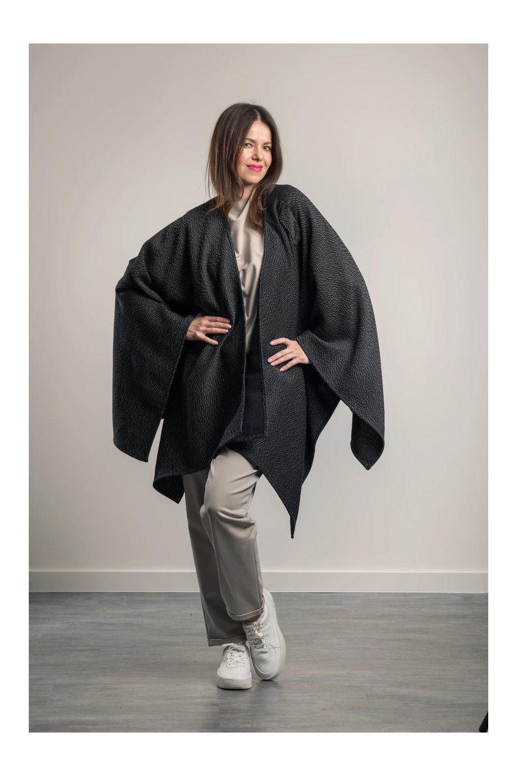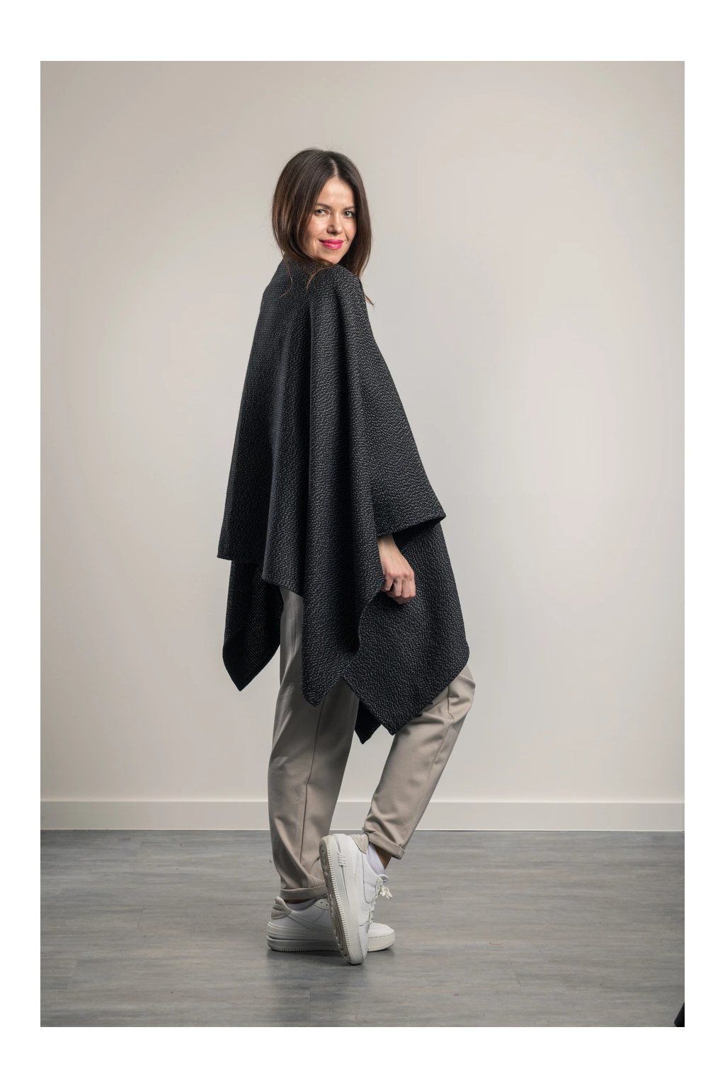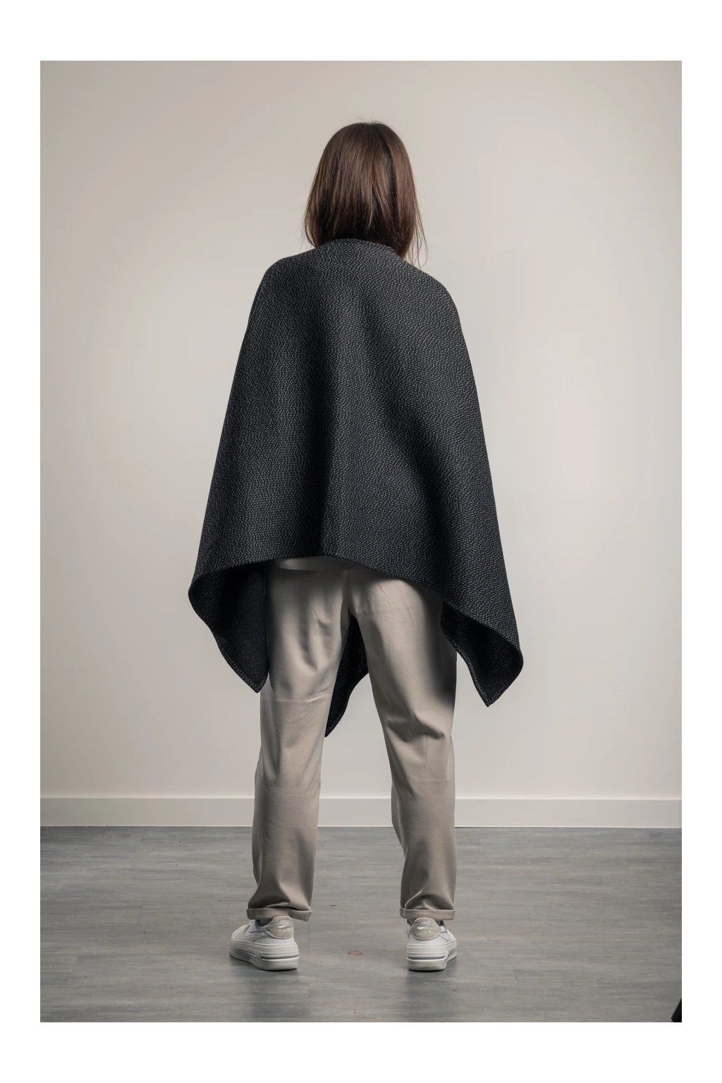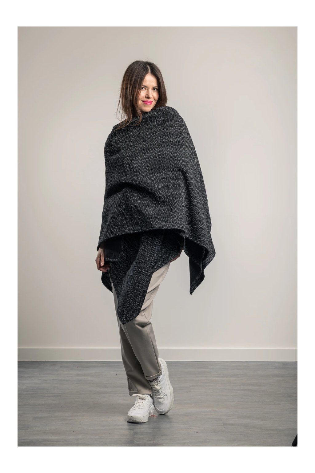 Velmi elegantní nadčasový pléd s ramením průvlekem ze 100% vlny, nahradí kabát či sako. Exkluzívní materiál. Má dlouhé cípy, které prodlouží postavu. Je vhodný k šatům či k večernímu outfitu, ale zároveň dodá ležérní eleganci k džínám a kalhotám nebo přes bundu. Barva: černá a bílá.