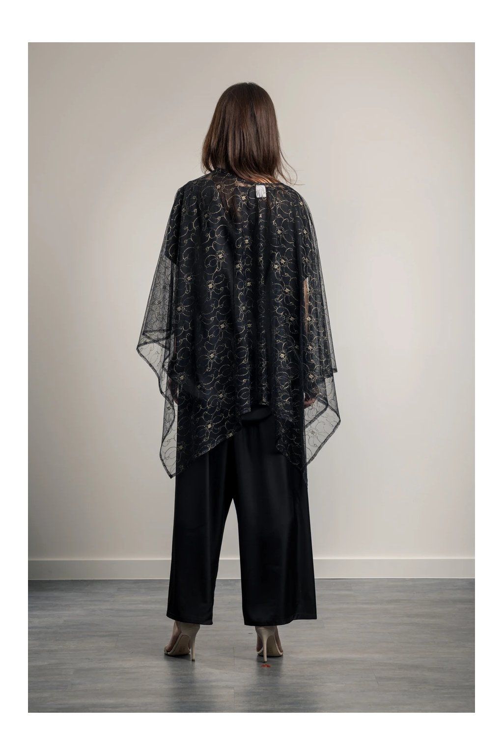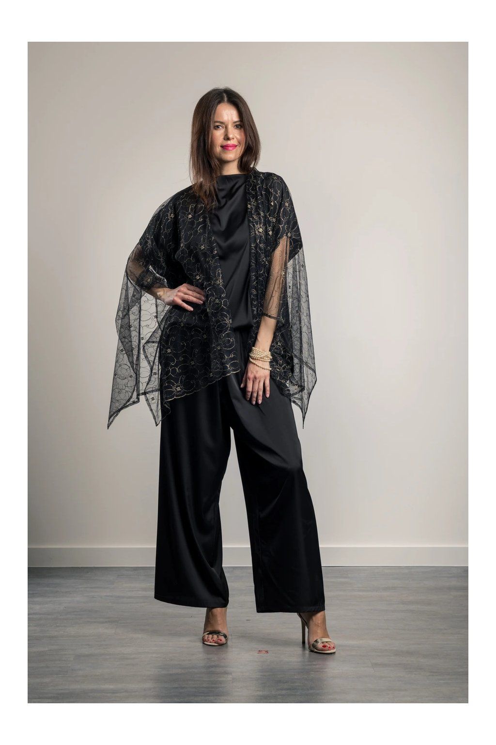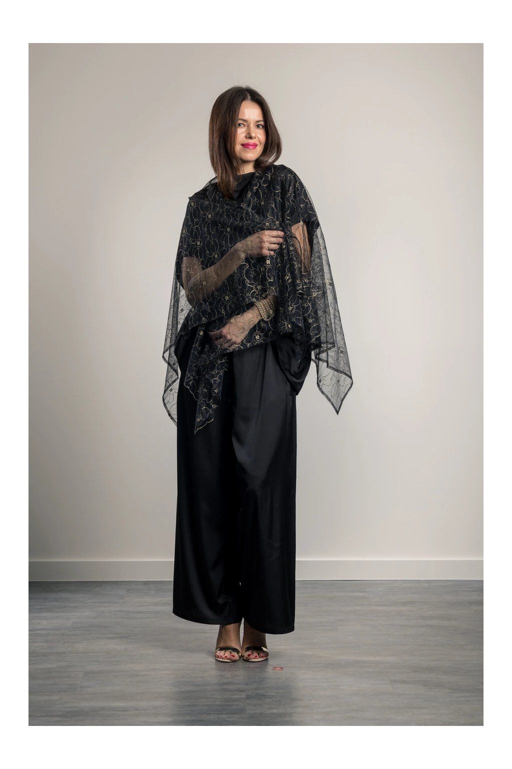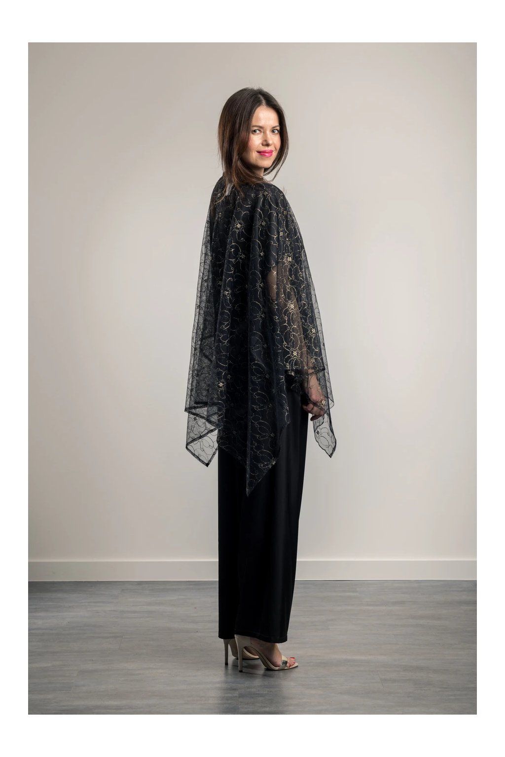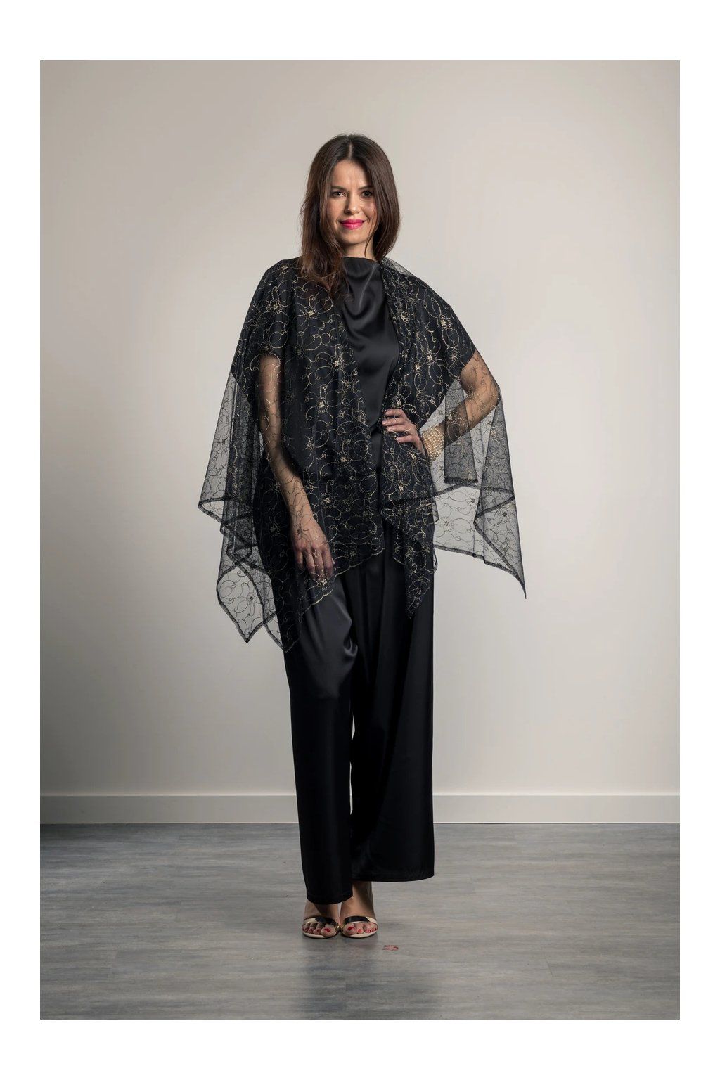 Buďte nepřehlédnutelná v Gold in Black Elegantní vzdušný pléd s efektním zlatým vzorem. Prodlužuje postavu. Pléd vhodný přes malé večerní i dlouhé plesové šaty. Velmi skladný, vejde se do malé kabelky.