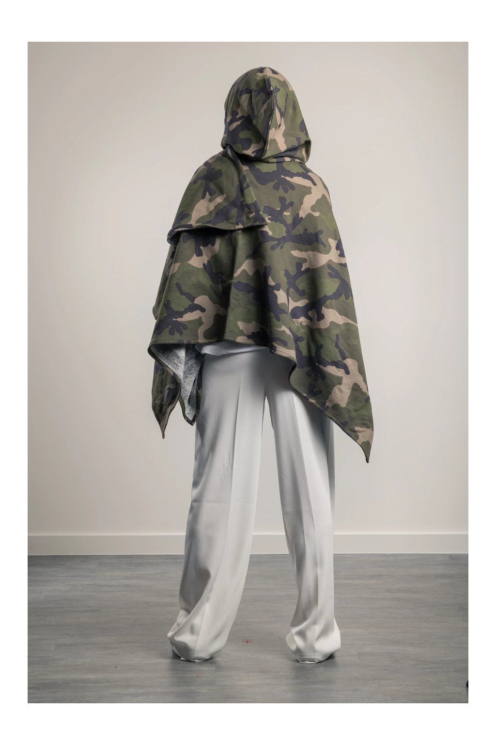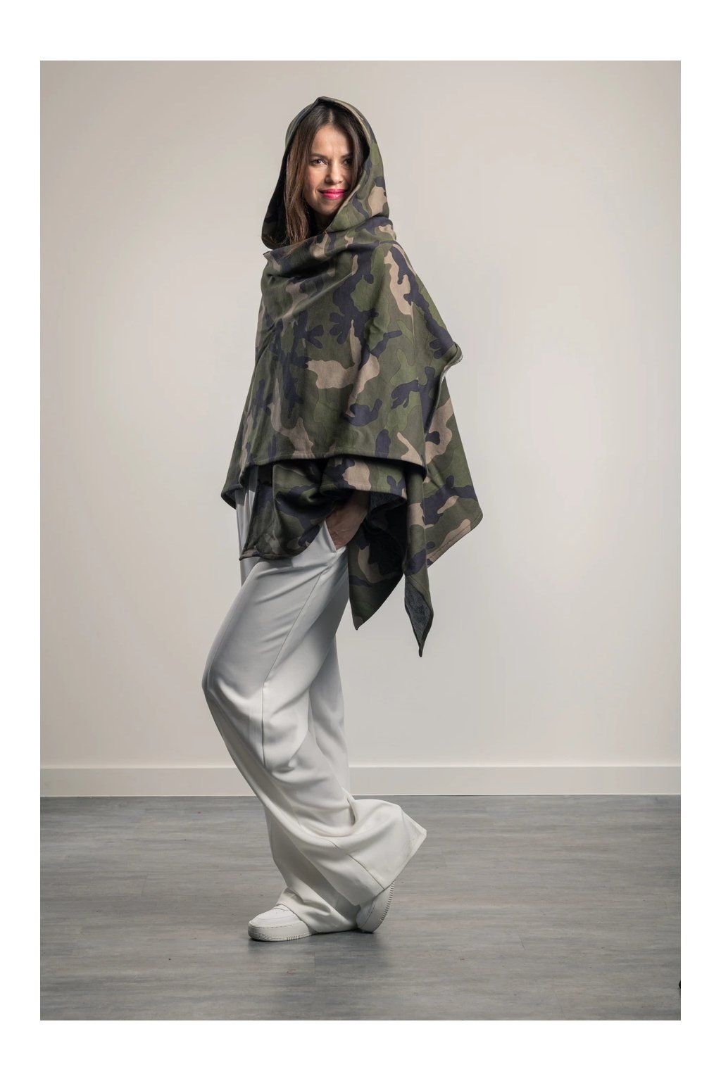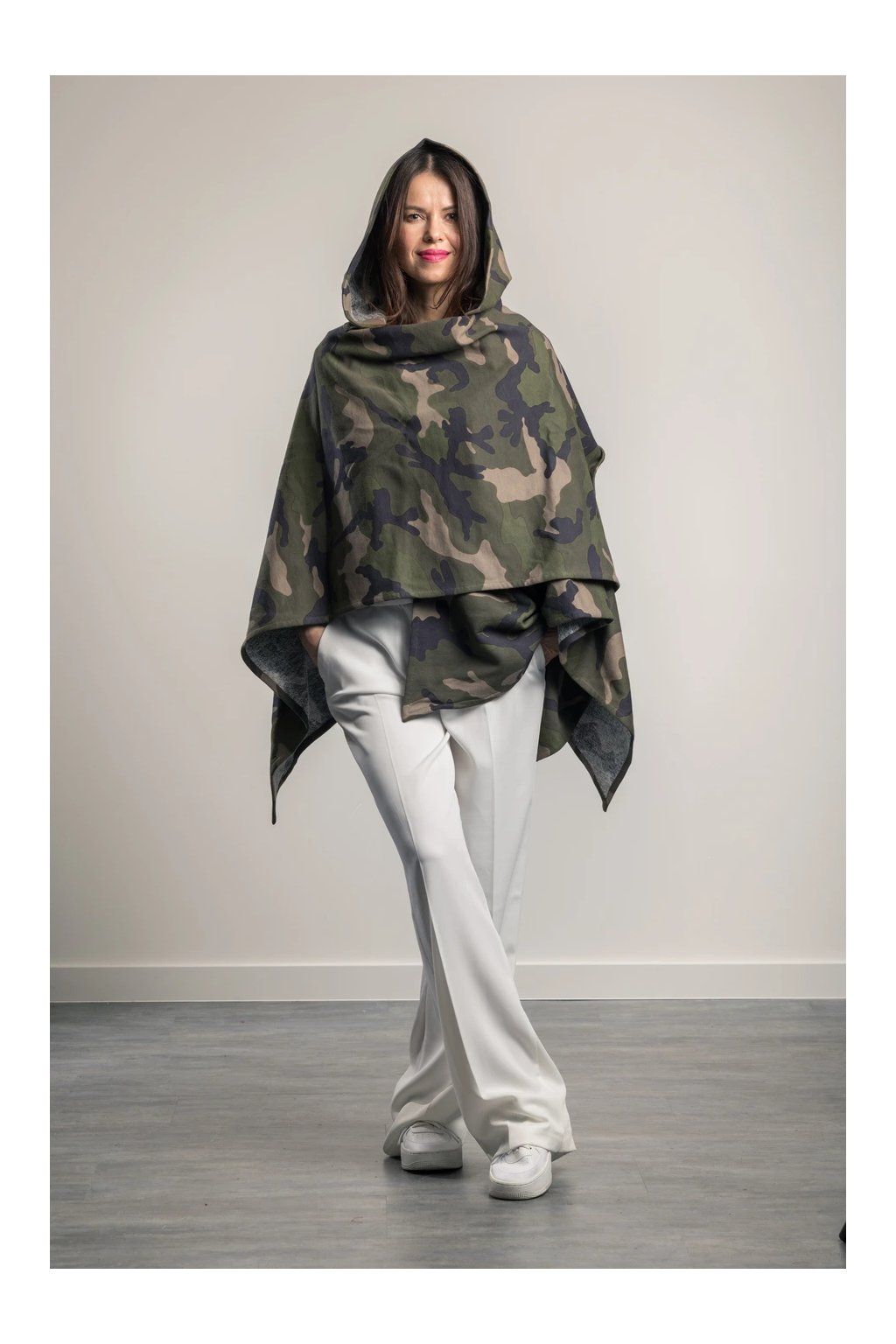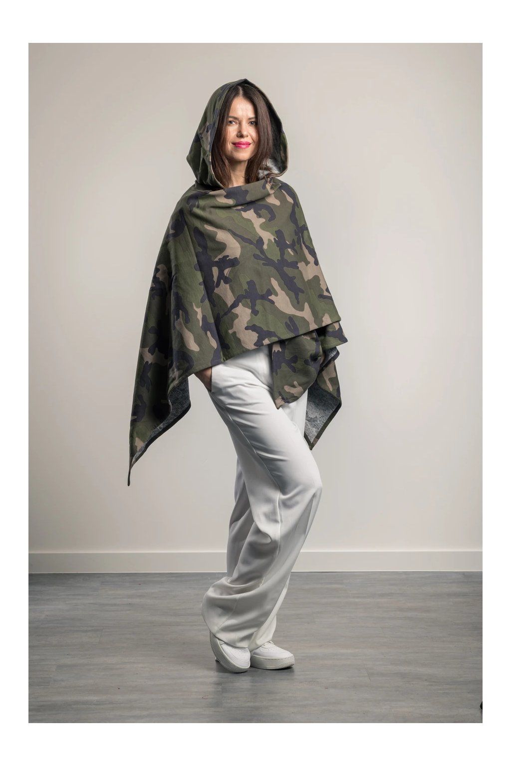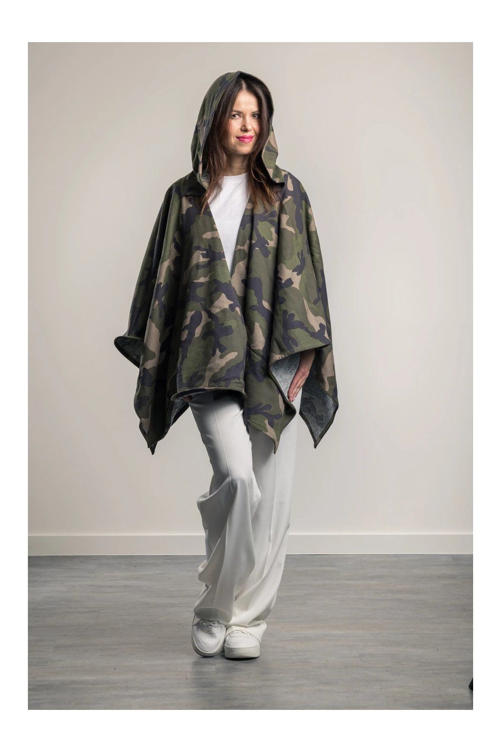 Ležérní pléd s kapucí v Army stylu skvěle doplní kalhotový outfit. Vhodný na víkend a volný čas.