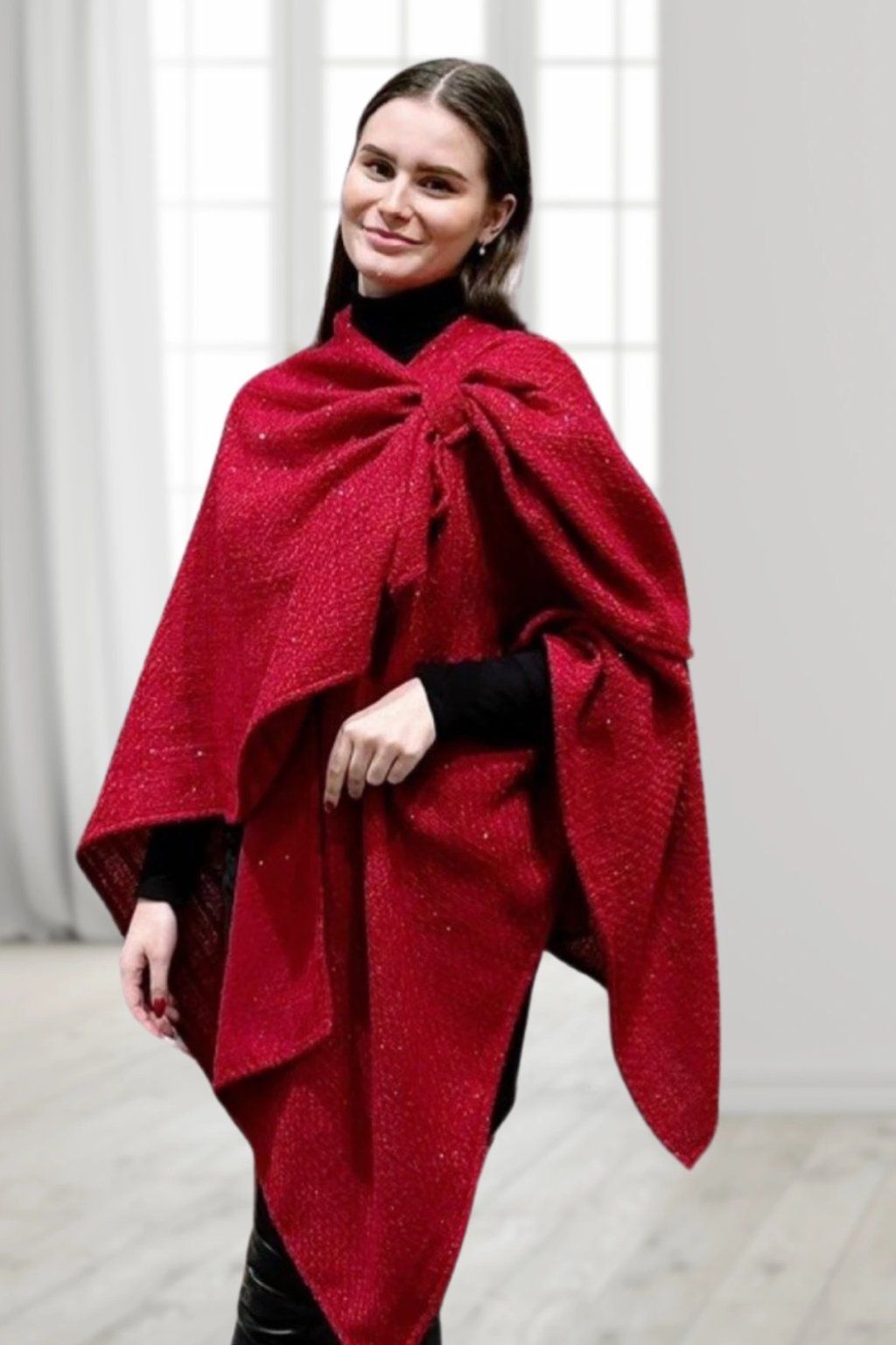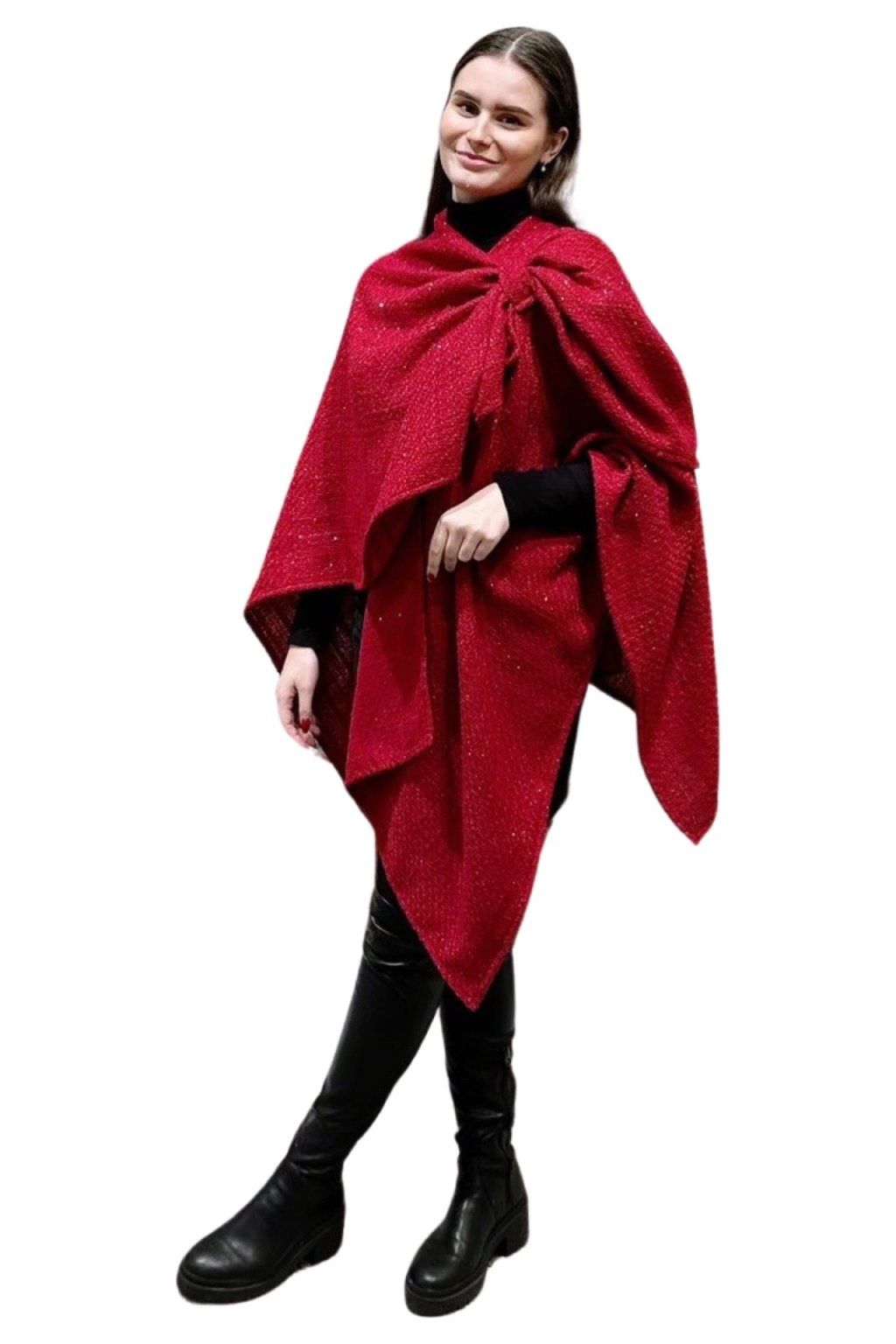 Velmi elegantní pléd cípatého střihu. Exkluzívní materiál s růžovou lurexovou nitkou. Nahradí sako i kabátek. Je vhodný na společenské události, koncerty, svatby, promoce, lze ho ale vynést i k džínám a bílému tričku. Pléd je velice detailně ručně zpracován.