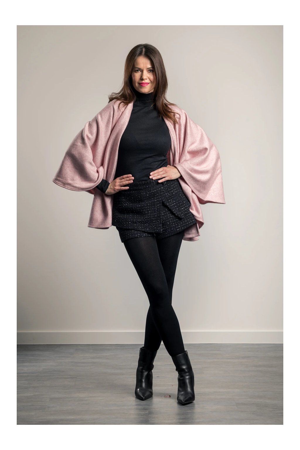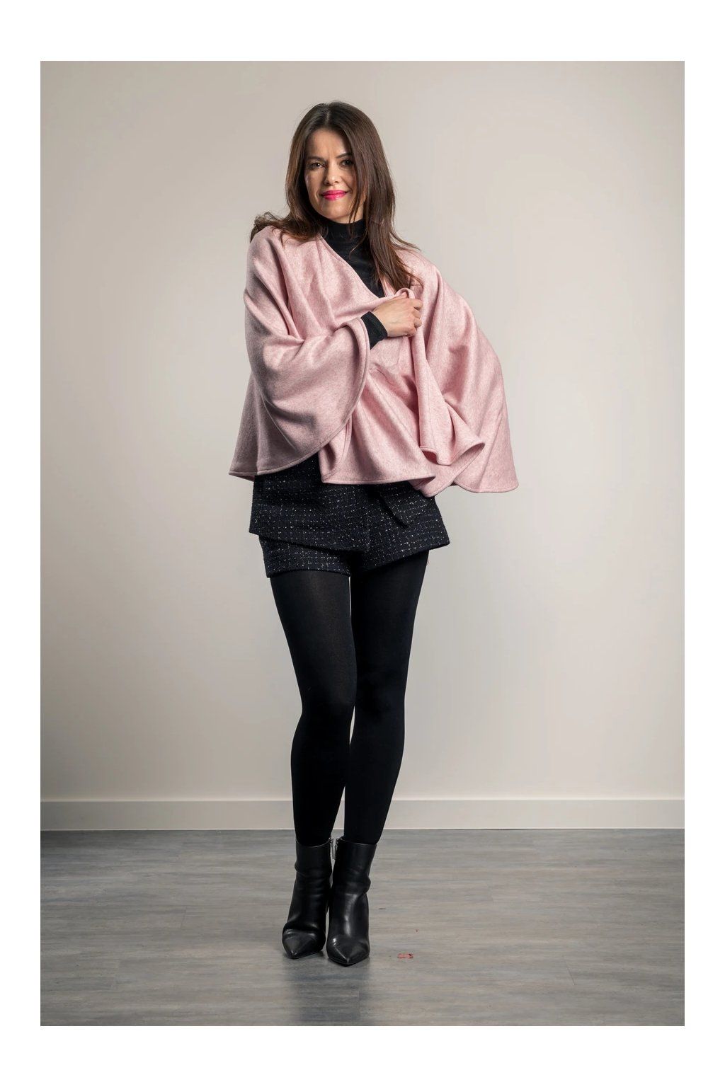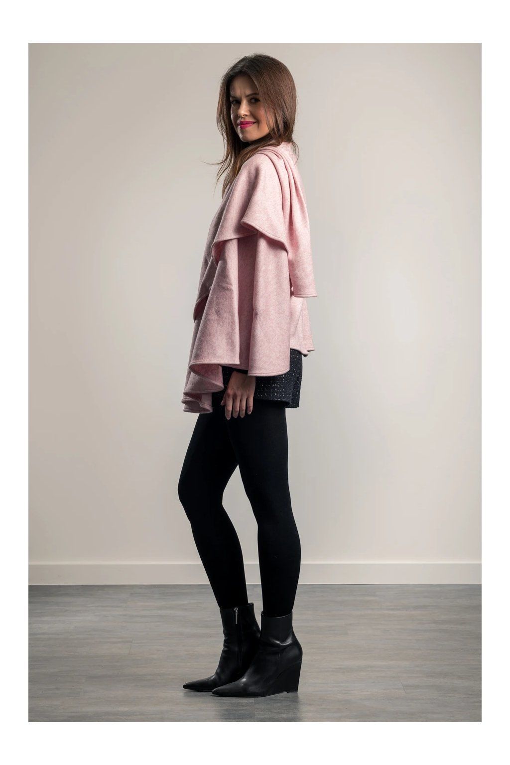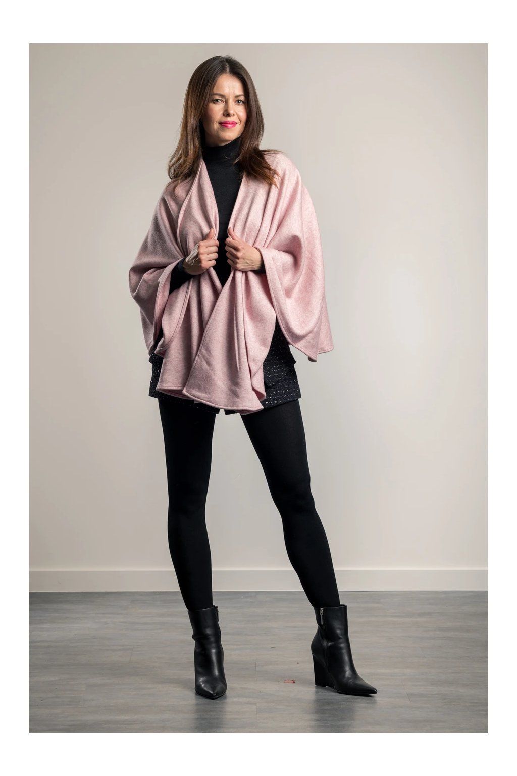 Elegantní svetrový pléd z velmi kvalitní italské pleteniny. Nabízí mnoho variant nošení plédu a to nejen v rámci společenských, ale volnočasových aktivit. Nemačká košili jako např. sako. Pléd naopak sako zcela nahradí, stejně jako nahradí třeba pončo nebo kabátek. Lze jej nosit i v zimě do kabátu místo velké šály, v interiéru pak nahradí svetr či cardigan. Perfektně ladí i k džínám, kožené bundě i elegantnímu outfitu. Barva: světle růžová.