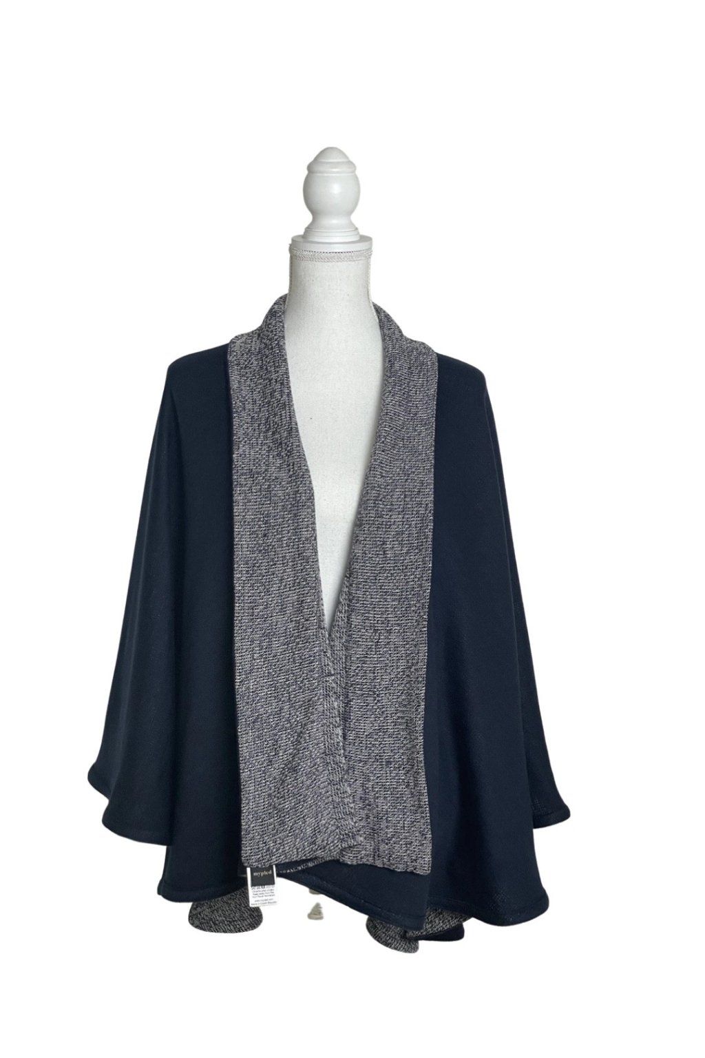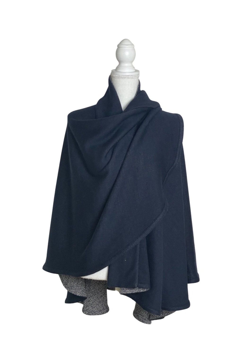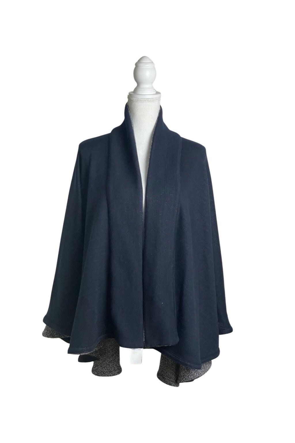 Elegantní svetrový pléd z velmi kvalitní italské pleteniny. Lze nosit v obou variantách stran látky. Nabízí mnoho variant nošení plédu a navíc dobře zahřeje. Pléd nemačká košili a zcela nahradí sako, stejně jako nahradí třeba pončo nebo kabátek. Lze jej nosit i v zimě do kabátu místo velké šály, v interiéru pak nahradí svetr či cardigan. Barva: tmavě modrá (1 strana) modrobíle žíhaná (2 strana).