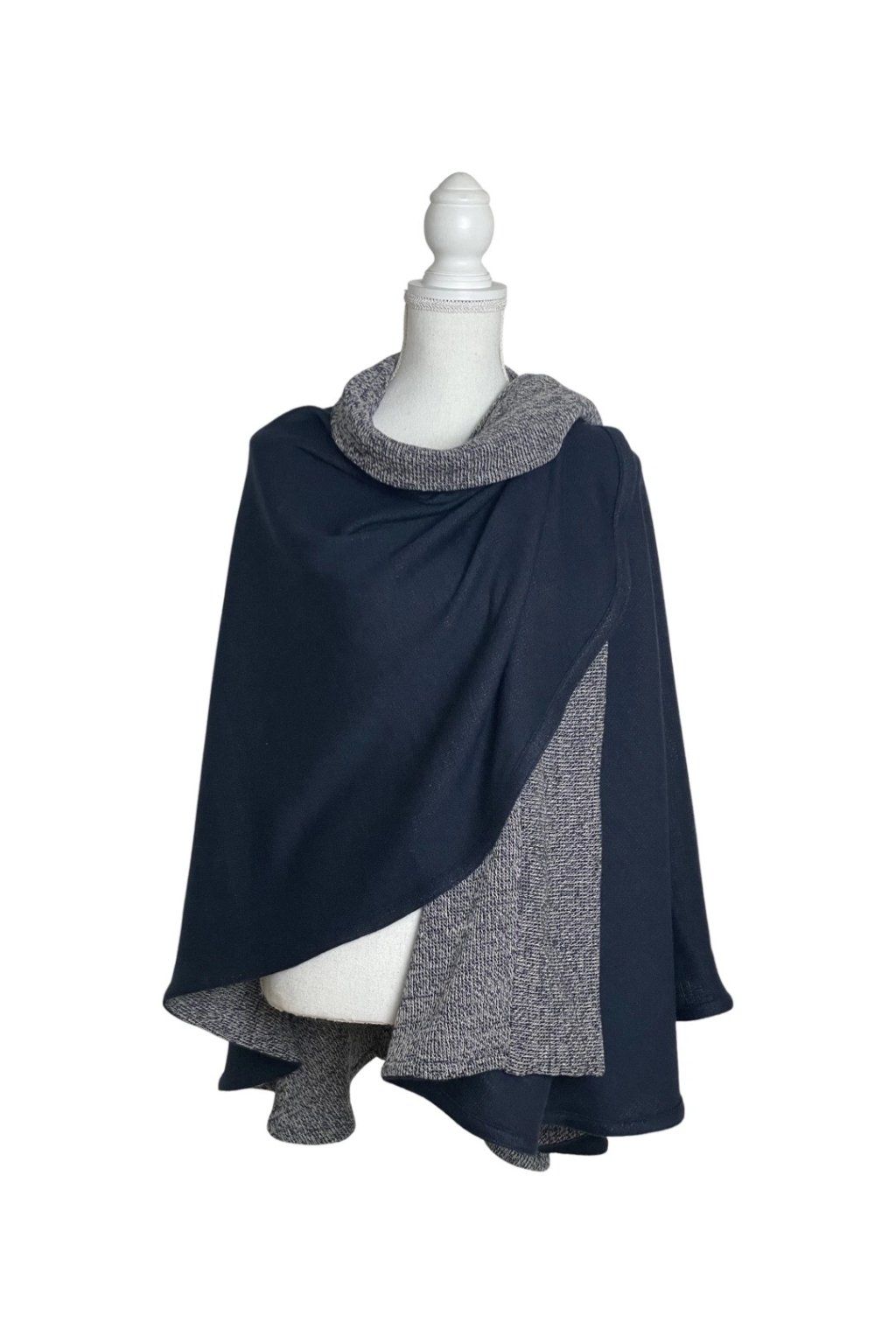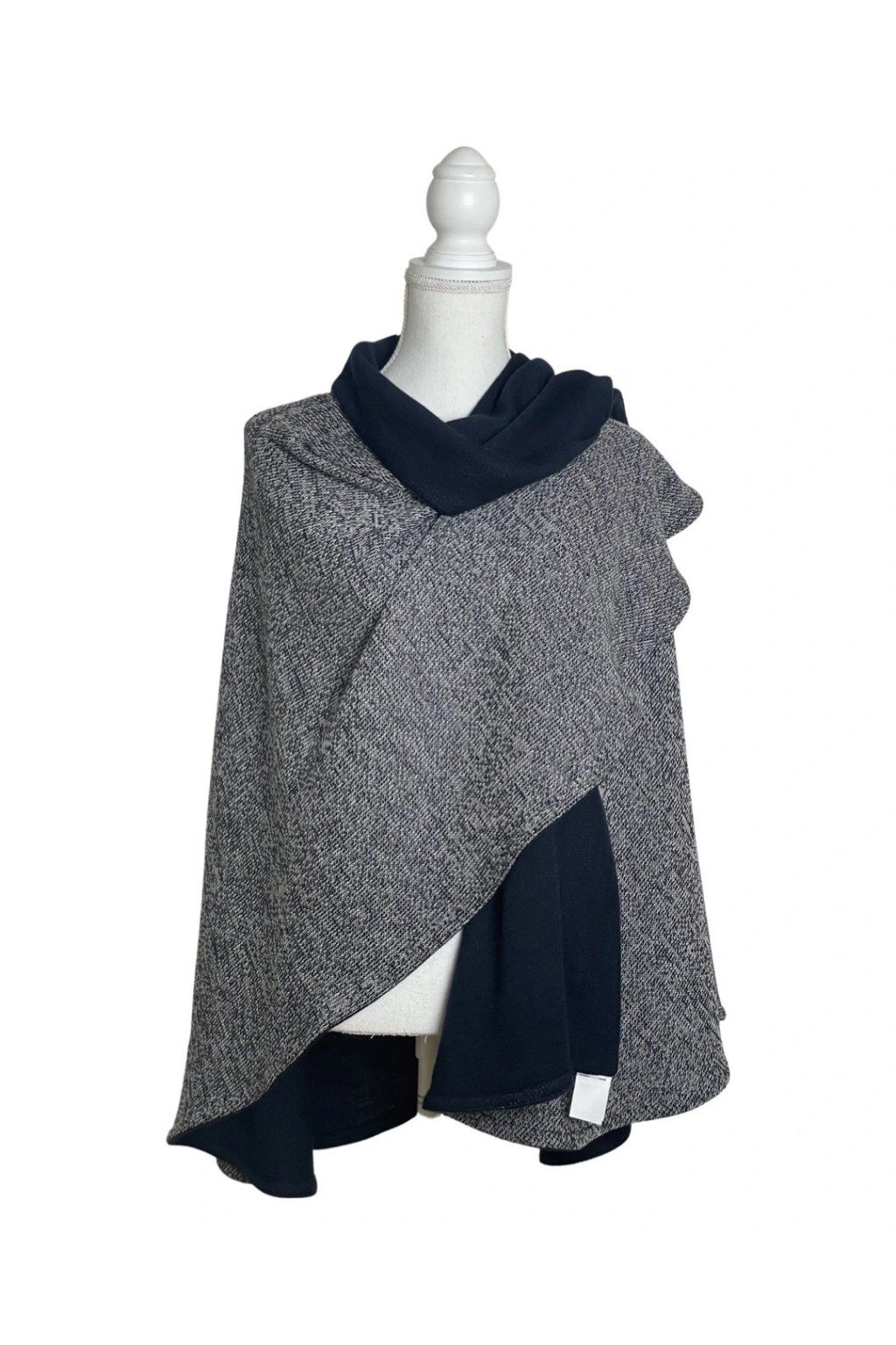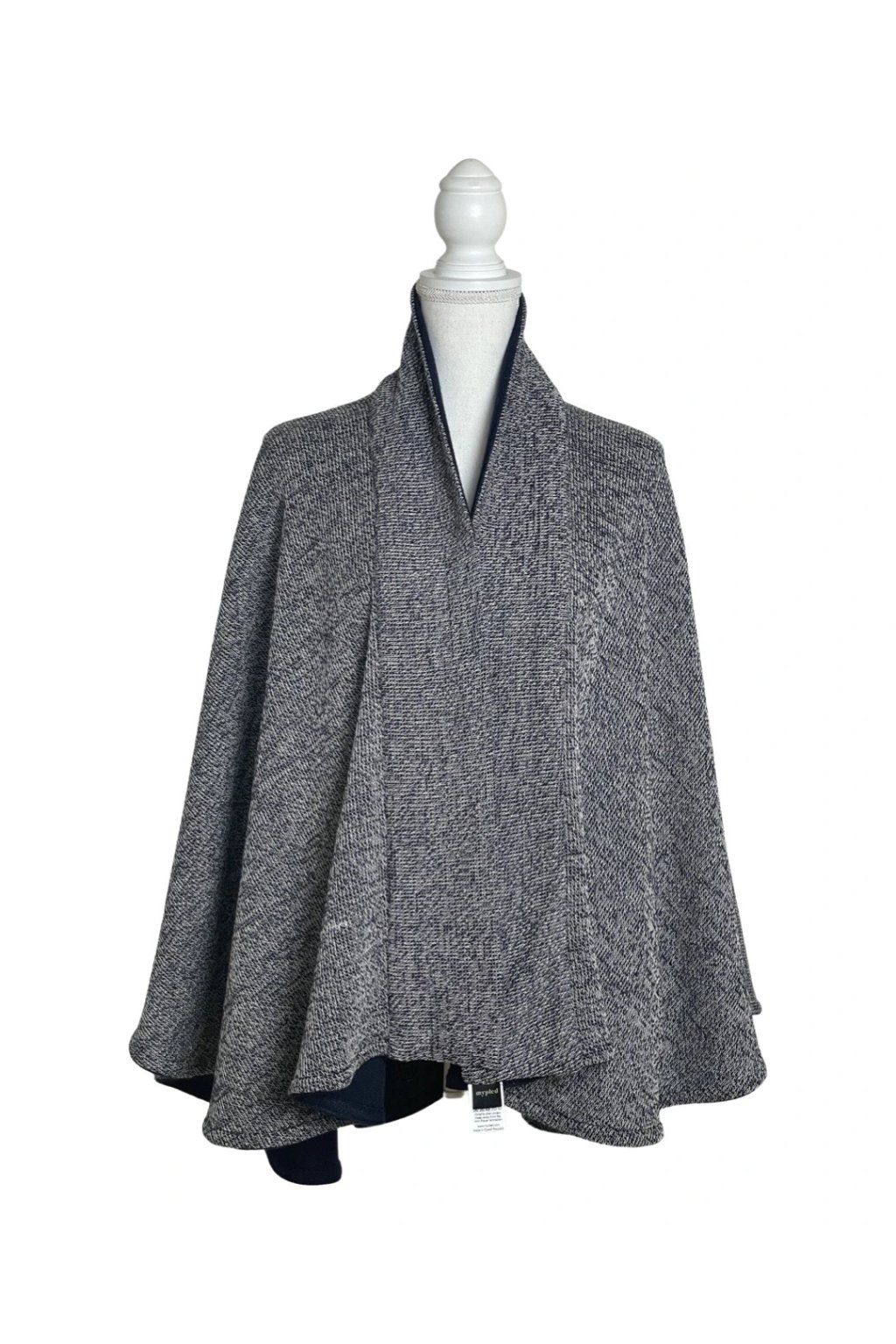 Elegantní svetrový pléd z velmi kvalitní italské pleteniny. Lze nosit v obou variantách stran látky. Nabízí mnoho variant nošení plédu a navíc dobře zahřeje. Pléd nemačká košili a zcela nahradí sako, stejně jako nahradí třeba pončo nebo kabátek. Lze jej nosit i v zimě do kabátu místo velké šály, v interiéru pak nahradí svetr či cardigan. Barva: tmavě modrá (1 strana) modrobíle žíhaná (2 strana).
