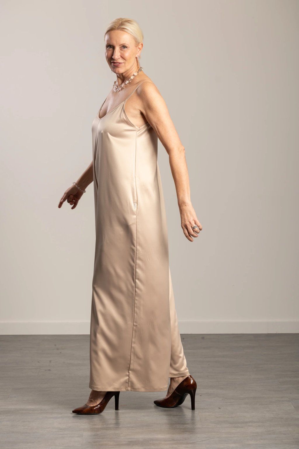 Decentní saténový lesk – plynule splývá, lichotí postavě a vypadá skvěle na fotkách i v pohybu.