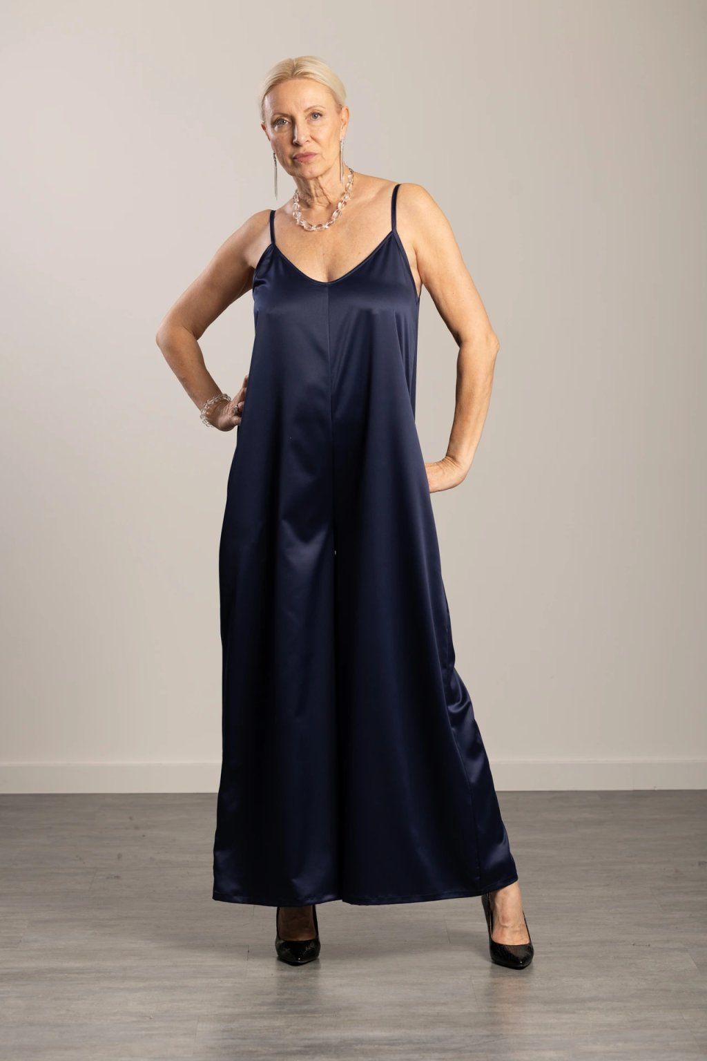 Saténový overal na tenká nastavitelná ramínka. Lehký, elegantní a pohodlný společenský kousek s jemným decentním leskem a lichotivou linií. Barva: tmavě modrá