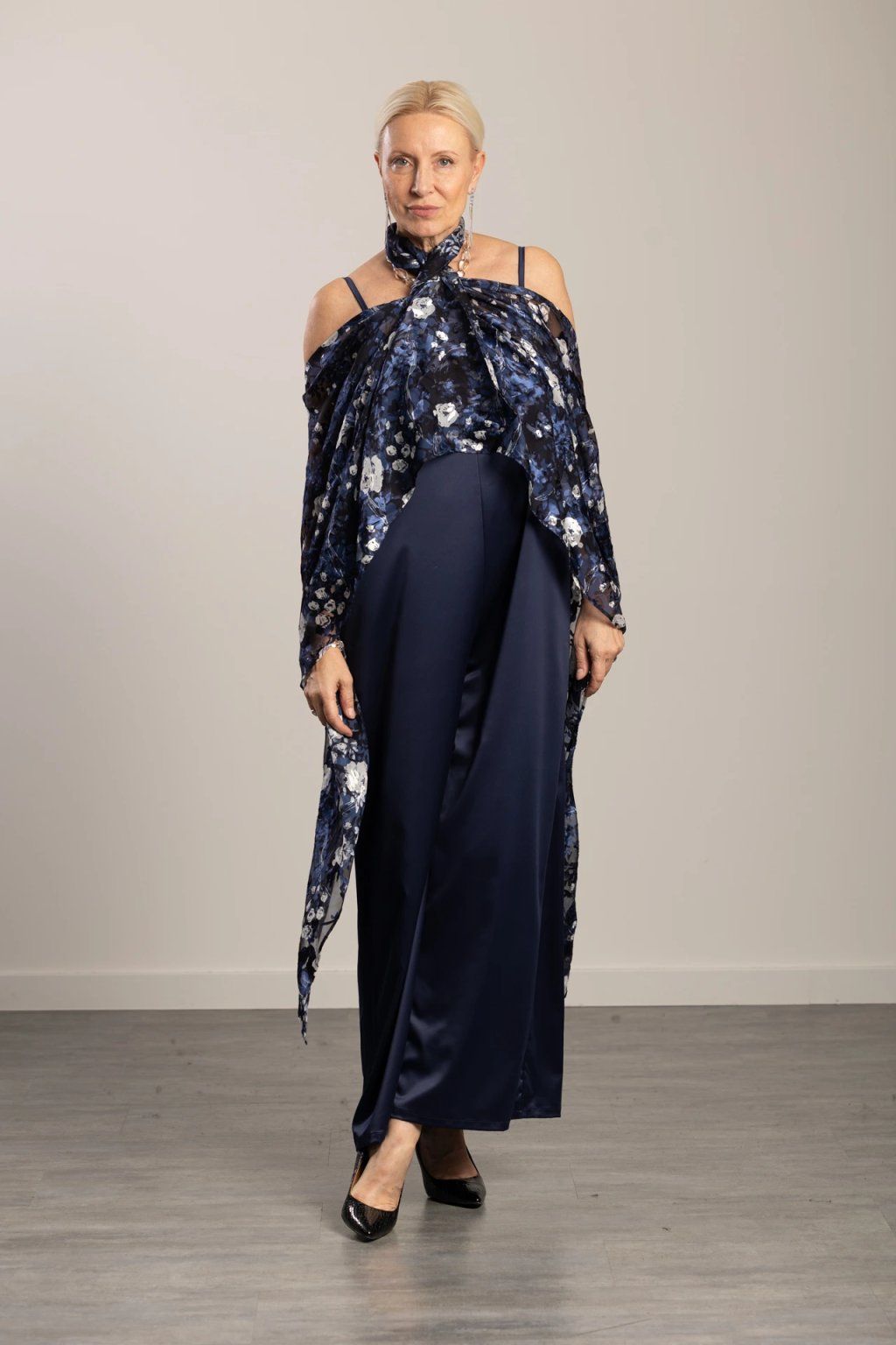 • Střih: společenský overal na tenká ramínka, ženská linie, volnější nohavice.