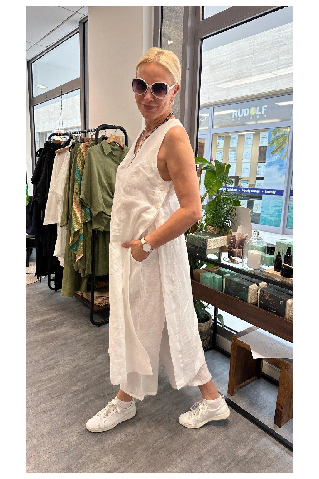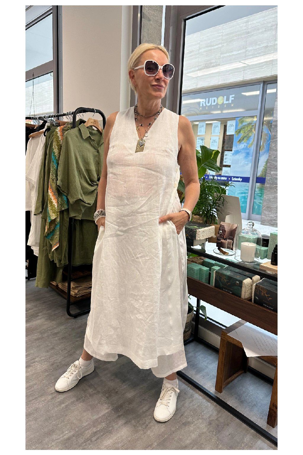 Objevte dotek přírody a dokonalou kombinaci elegance a pohodlí s naší lněnou tunikou Lenny Linen. Dlouhá tunika s vysokými rozparky na bocích a sofistikovaným zapínáním na každé straně na 2 knoflíky je sólistou v naší kolekci Linen. Poskytuje maximální pohodlí a je ideálním letním společníkem do práce i pro volný čas. Lze ji nosit s kalhotami Romy ze stejné kolekce i s naším koženým vázacím páskem, ale fantazii se meze nekladou!
