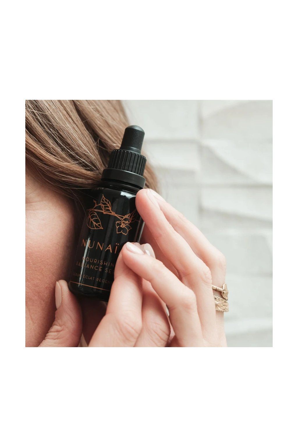 Po vyčištění a tonizaci pleti večer naneste 3–4 kapky séra Nourishing Radiance Serum na konečky prstů a postupujte podle kroků Nunaïa Ritual® pro aktivaci séra a zvýšení jeho účinků.